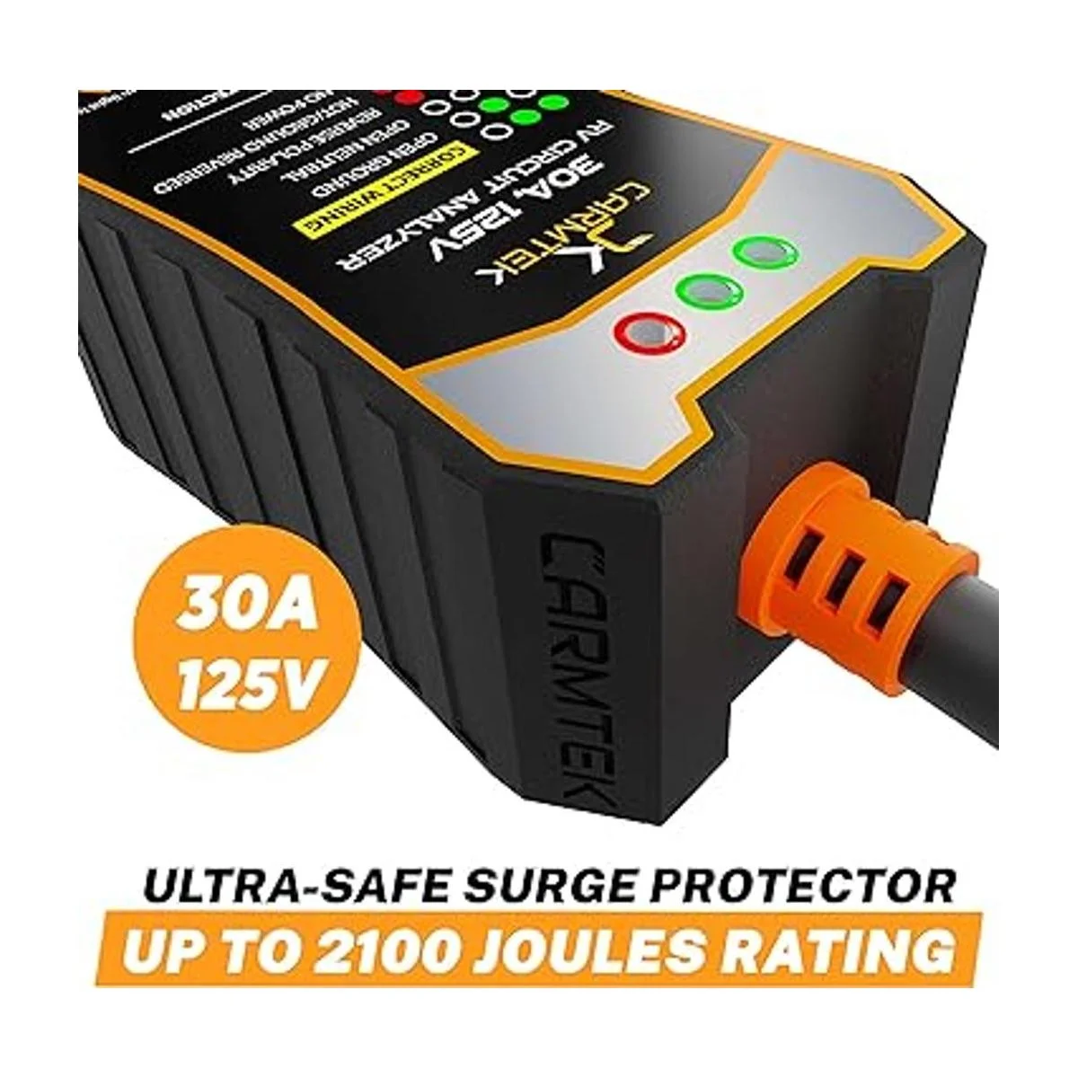 Equipo ultra seguro: el protector de sobretensiones Carmtek de 30 amperios RV está fabricado con material ignífugo por lo que es extra seguro de usar. Especialmente diseñado para uso en exteriores, el protector de sobretensiones de 30 amperios es resistente a la intemperie y protegido térmicamente.