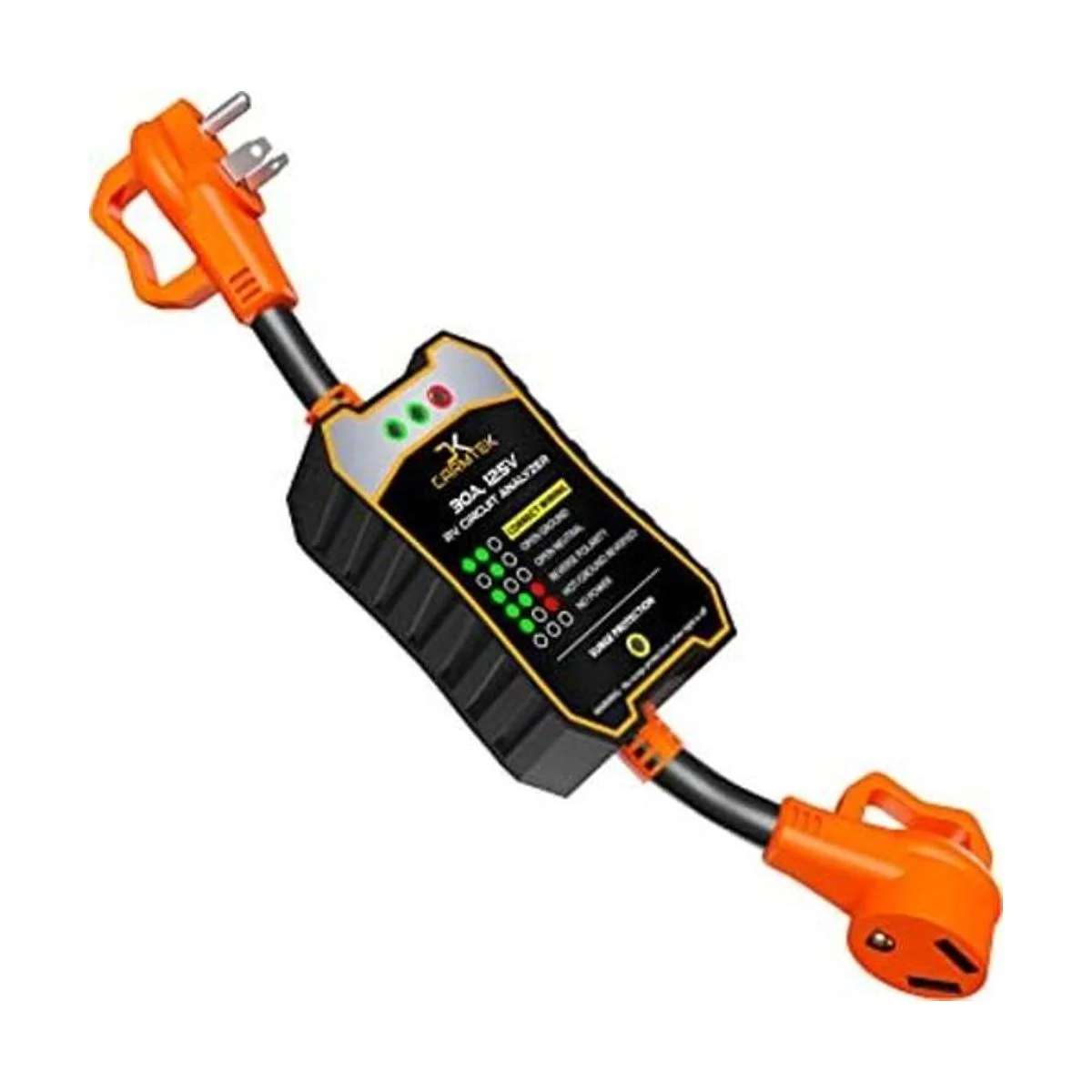 Analizador de circuito: te permite probar la calidad de tu energía antes de conectar tu RV, verificando si la fuente de alimentación está correctamente cableada y ayudando a detectar la mayoría de fallos de cableado. La tabla de diagnóstico del analizador de circuito RV de 30 A proporciona indicación de fallo para los siguientes fallos de cableado: cableado correcto, tierra abierta, neutro abierto, polaridad inversa, marcha caliente/tierra, sin energía.