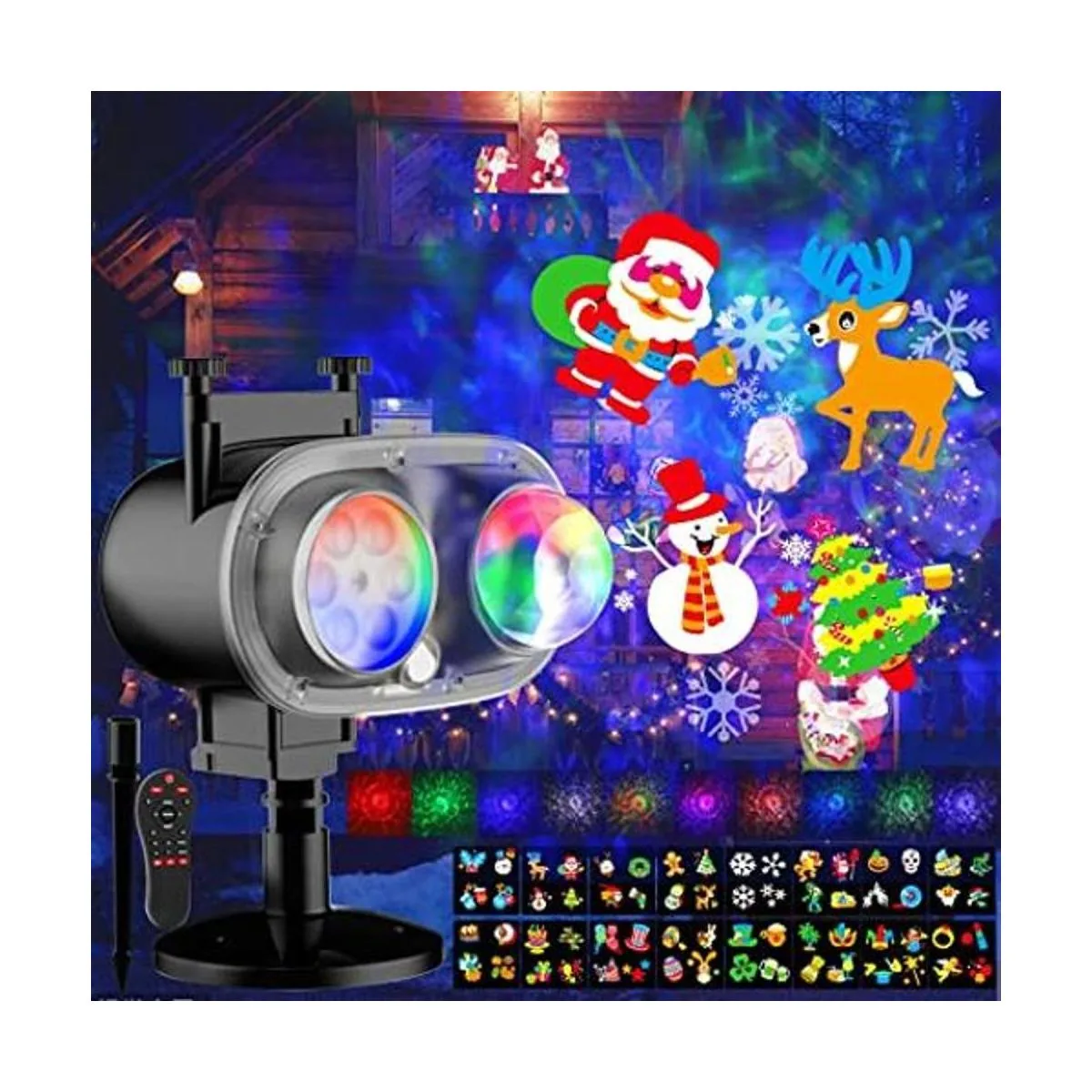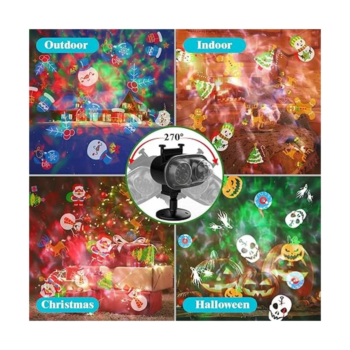 Ola del océano 3D y 16 patrones delicados Este proyector de luz nocturna tiene dos lentes de proyección, una para efecto de onda de agua RGBW y el otro para proyección de imagen de patrón. 16 tipos de diferentes patrones de temática navideña, con 10 colores diferentes de efectos de onda, puede crear cualquier ambiente festivo, adecuado para varias escenas. 16 diapositivas de patrón pueden funcionar de larga vida útil y no se decoloran.