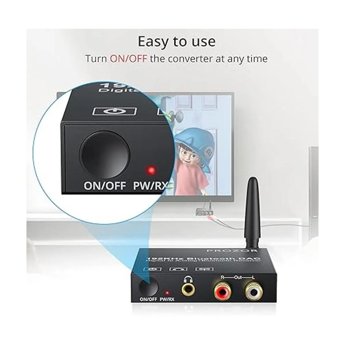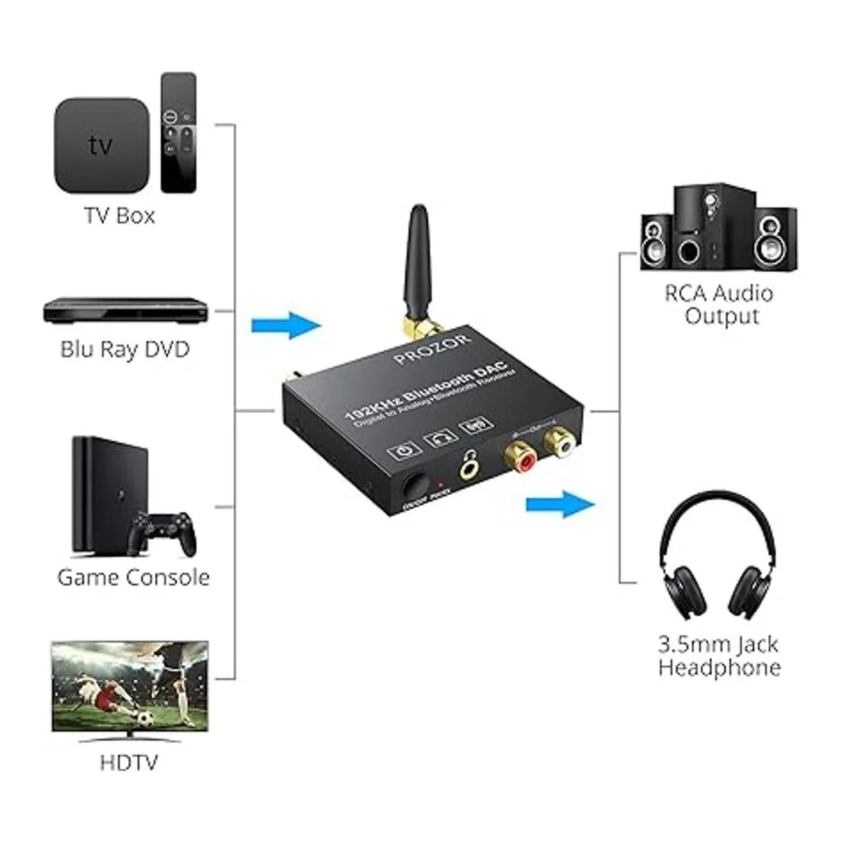 PROZOR Convertidor digital a analógico: soporta señales de audio digitales ópticas, coaxiales, transmitidas por Bluetooth en RCA analógica estéreo y salida de audio de 0.138 in cuando se conecta al amplificador.