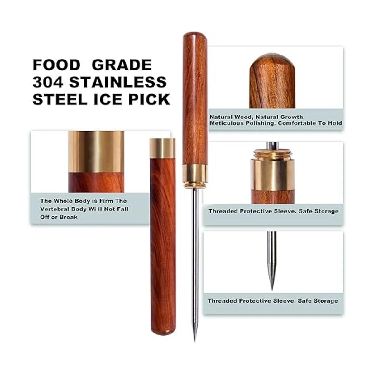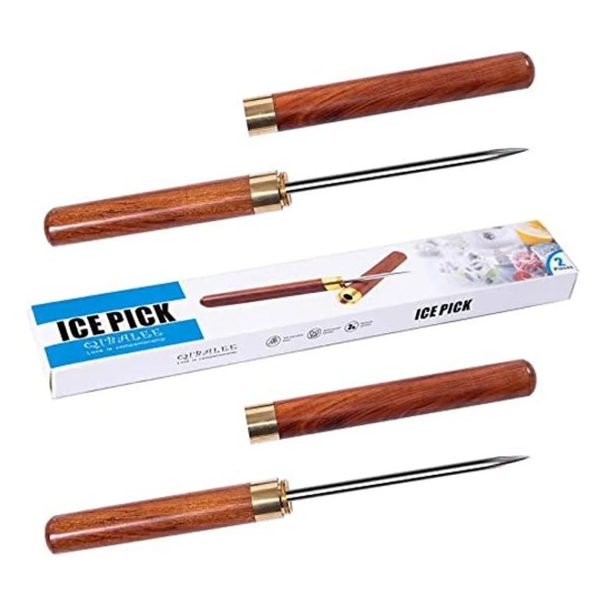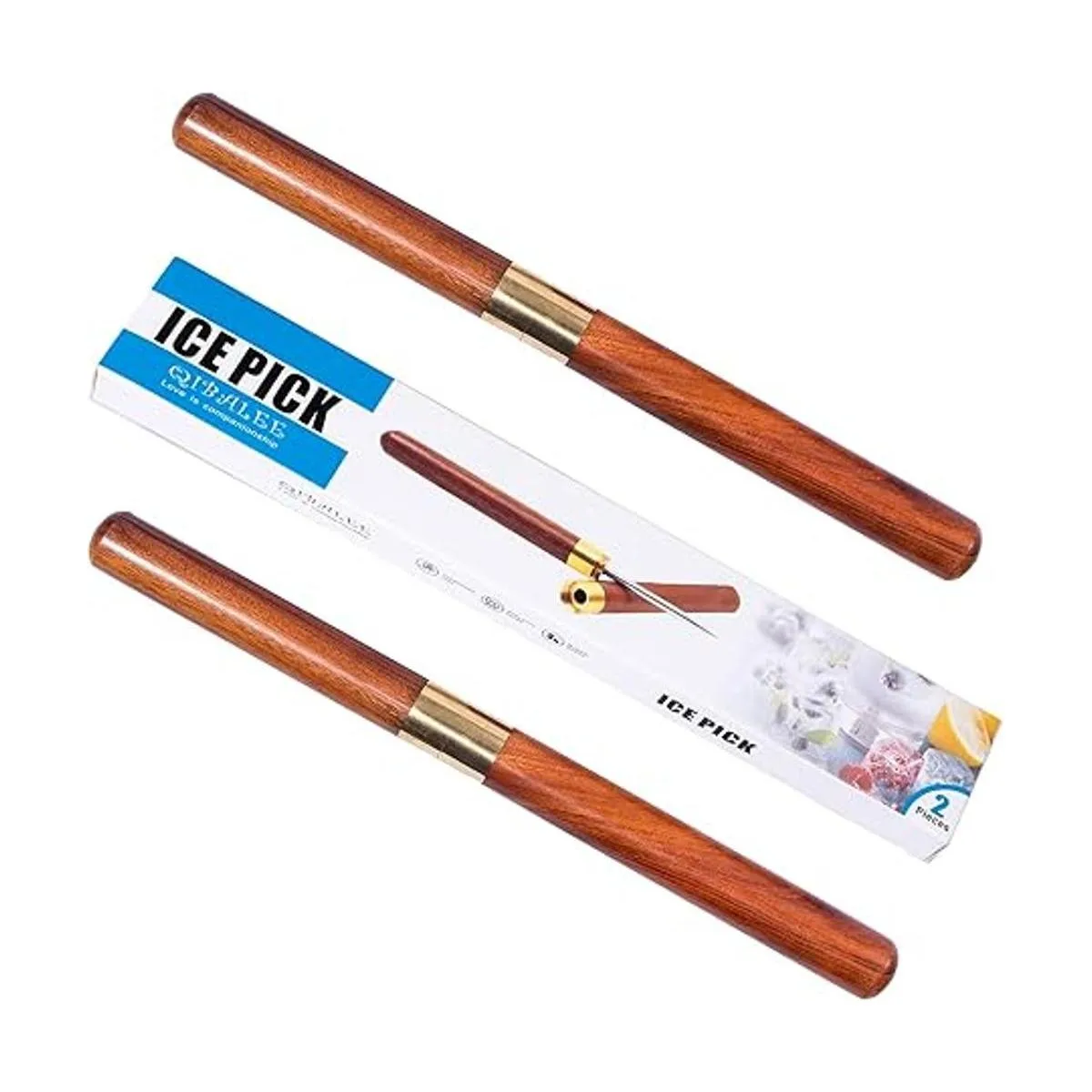 Púas de hielo de 9.4 pulgadas, 2 piezas. Púas de hielo para romper el hielo. Hecho de madera de pino de calidad y acero inoxidable 304 de grado alimentario. Tapas de madera seguras y asas de madera antideslizantes. Fácil de almacenar. Para uso en cocinas