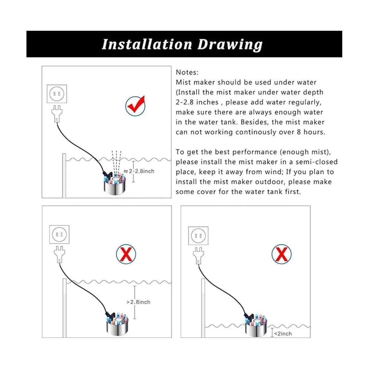 Fácil de usar : ponlo en el agua y luego sale la niebla y tiene un diseño seguro de voltaje de 24 V. Instala la máquina de niebla bajo la profundidad del agua de 2 a 2.8 pulgadas nivel de agua: 0.6 pulgadas entre el sensor del fabricante de niebla y la superficie del agua