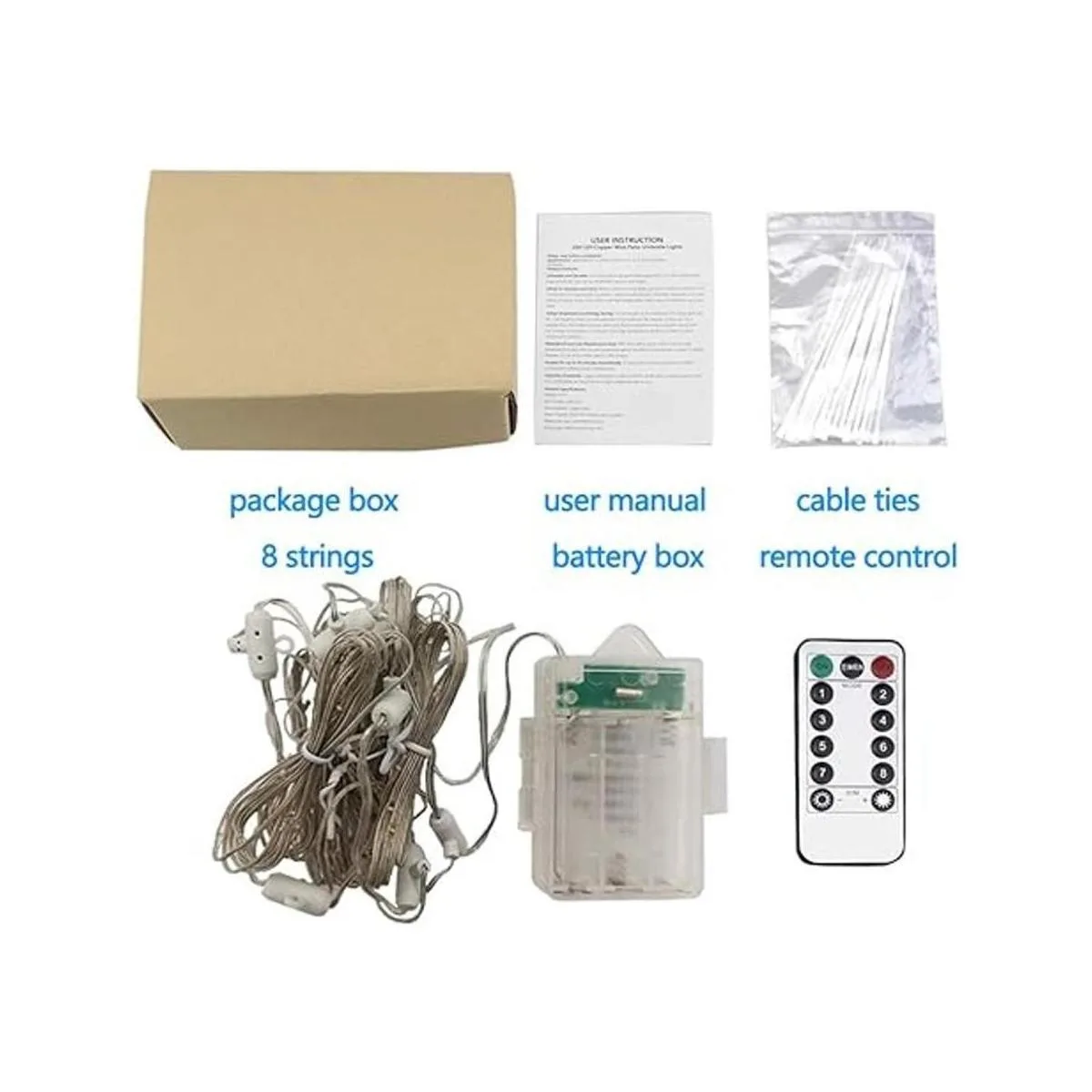 Fácil de usar: viene con bridas para cables, simplemente utiliza las bridas para atar cada cuerda y coloca la caja de la batería en la parte superior de paraguas y tiendas de campaña, luego controla la luz con el control remoto.
