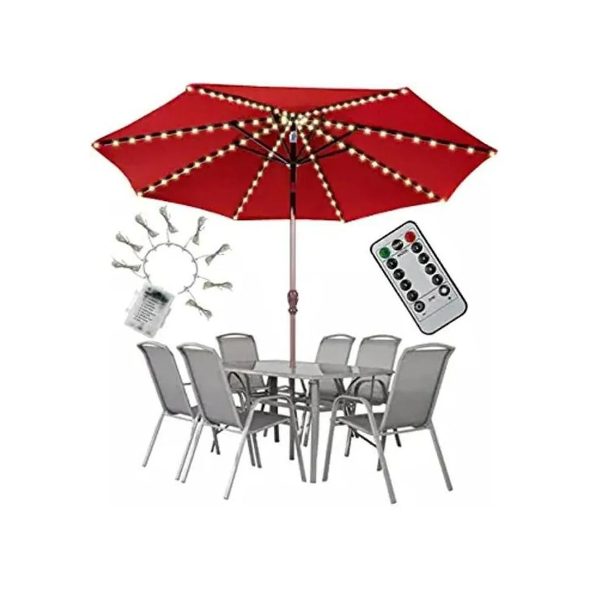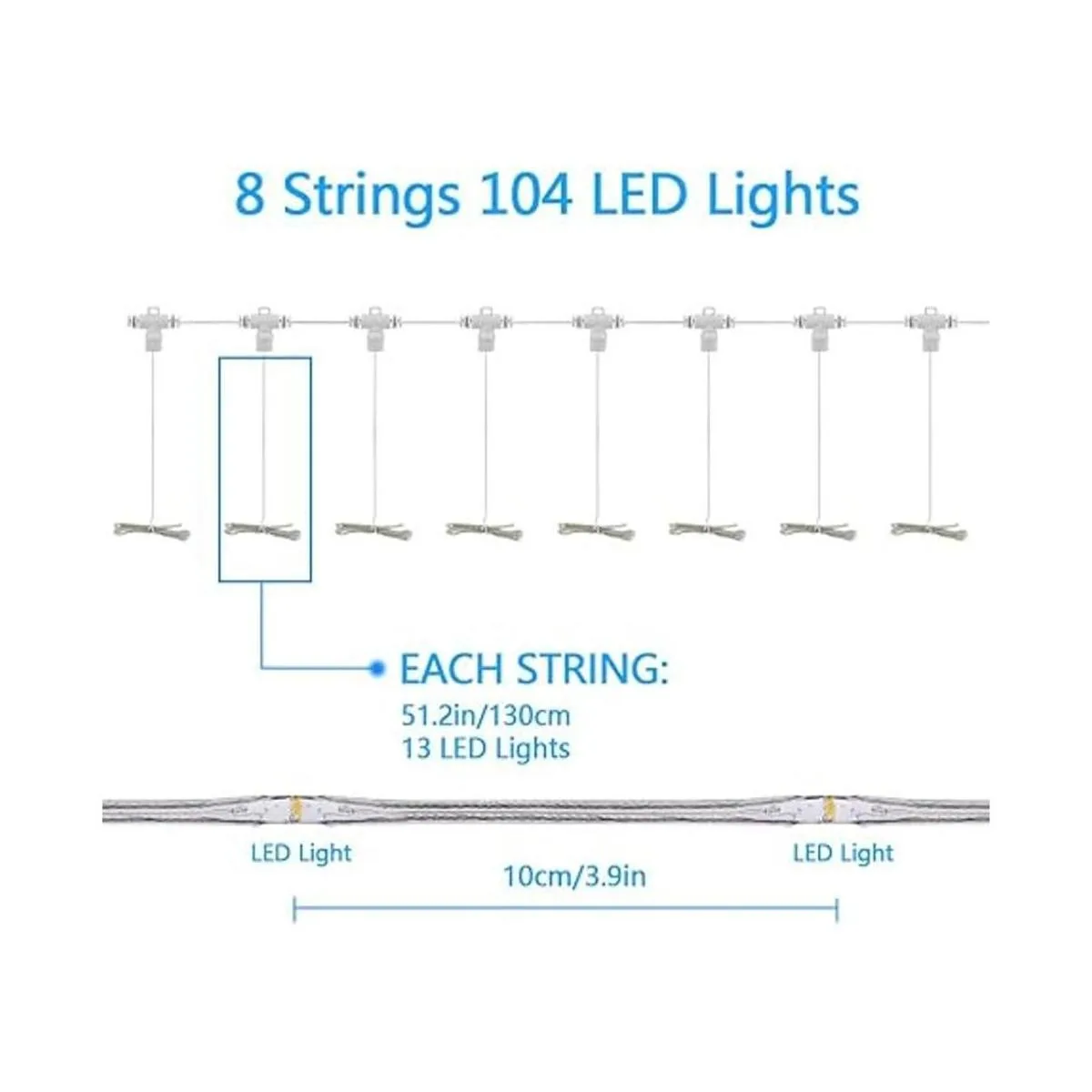 8 x 13 luces LED para paraguas 104 luces LED y 8 cuerdas, 13 luces LED por cuerda, cada cadena está diseñada con alambre de cobre súper suave, tiene ductilidad fina y se puede doblar moderadamente a cualquier forma, largo tiempo de servicio, IP67 impermeable y resistente al polvo. Adecuado para sombrillas de patio y tienda de campaña al aire libre con 8 varillas.