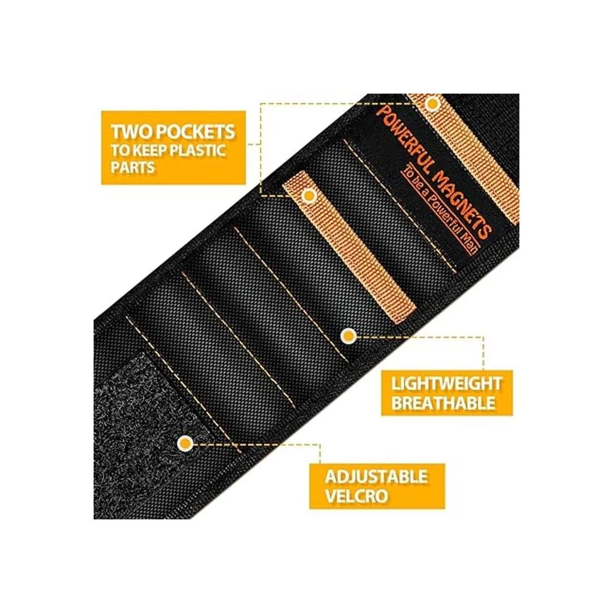 Diseño fantástico: La costura perfecta de la pulsera con 15 imanes superpotentes, hace que la banda magnética para herramientas envuelva casi toda la muñeca. La pulsera magnética tiene una gran superficie para almacenar y acceder fácilmente a objetos magnéticos como tornillos, clavos, puntas de destornillador, brocas, tuercas, arandelas y pernos, etc. Además proporciona dos bolsillos de diferente tamaño útil para artículos no magnéticos. Muy práctico, se puede denominar como una necesidad de la caja de herramientas.