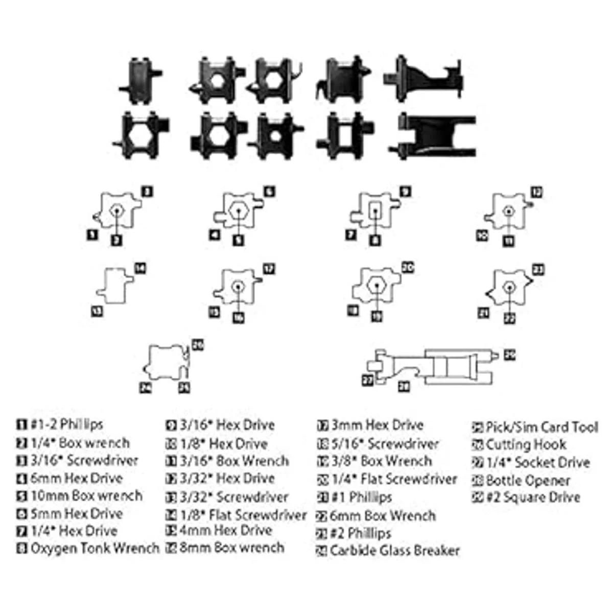 Multifunción: todo tipo de llaves de vaso, llaves hexagonales, destornilladores hexagonales, destornilladores de hoja plana y destornilladores Phillips, llaves de cilindro de oxígeno, interruptores de vidrio de carburo cementado, púas de tarjeta SIM, ganchos de corte, adaptadores de accionamiento de enchufe y abrebotellas.