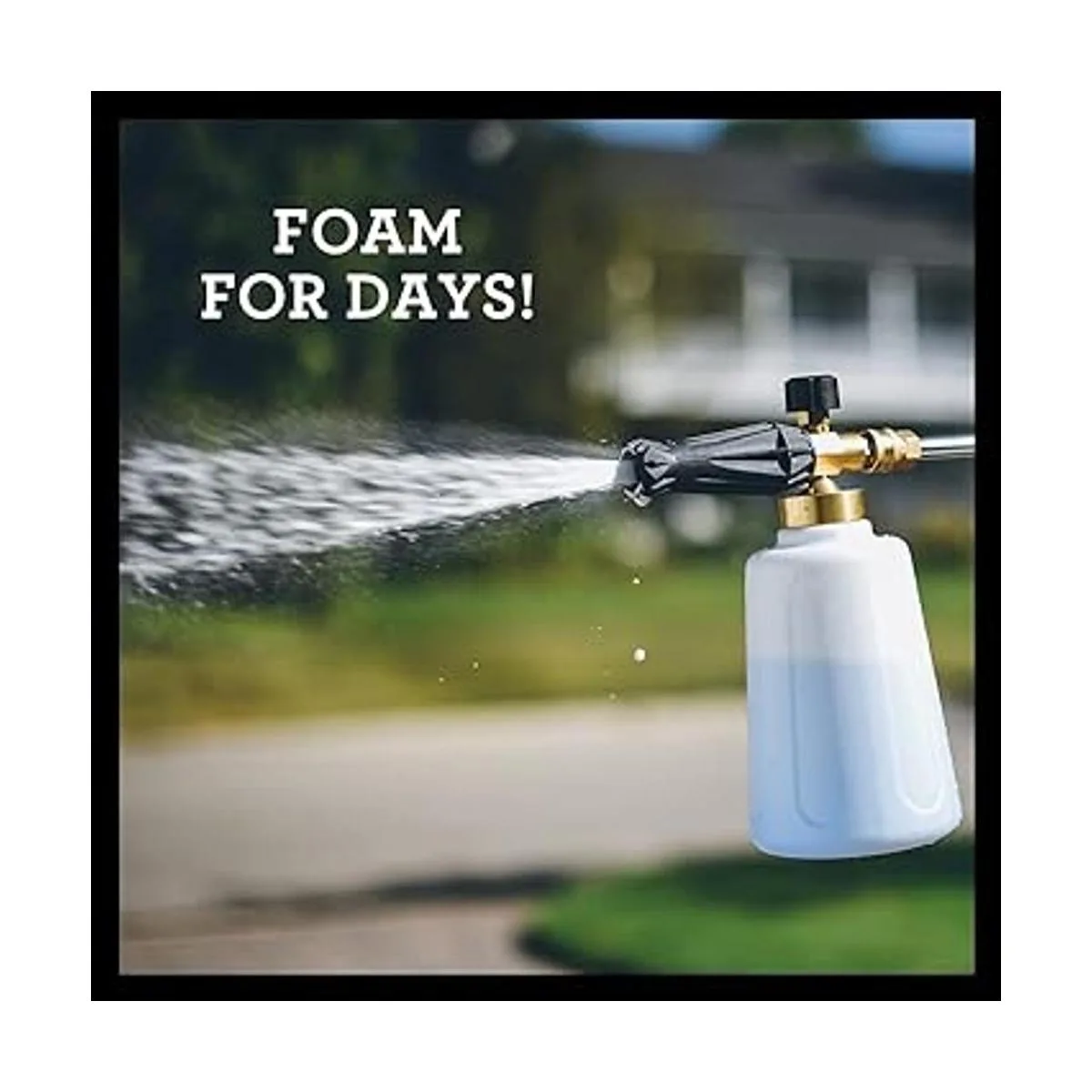 Fácil de usar simplemente llenar el depósito de agua con jabón, haga clic en a su lanza de alta presión existente o disparador, ajustar el perilla para su nivel de espuma deseado, y spray.