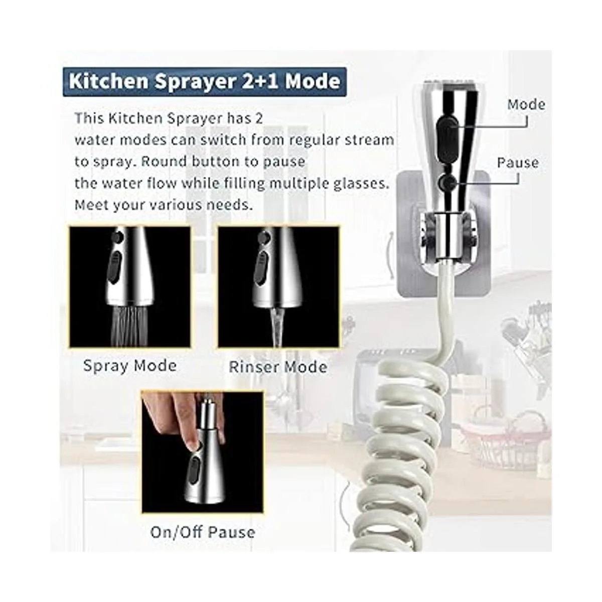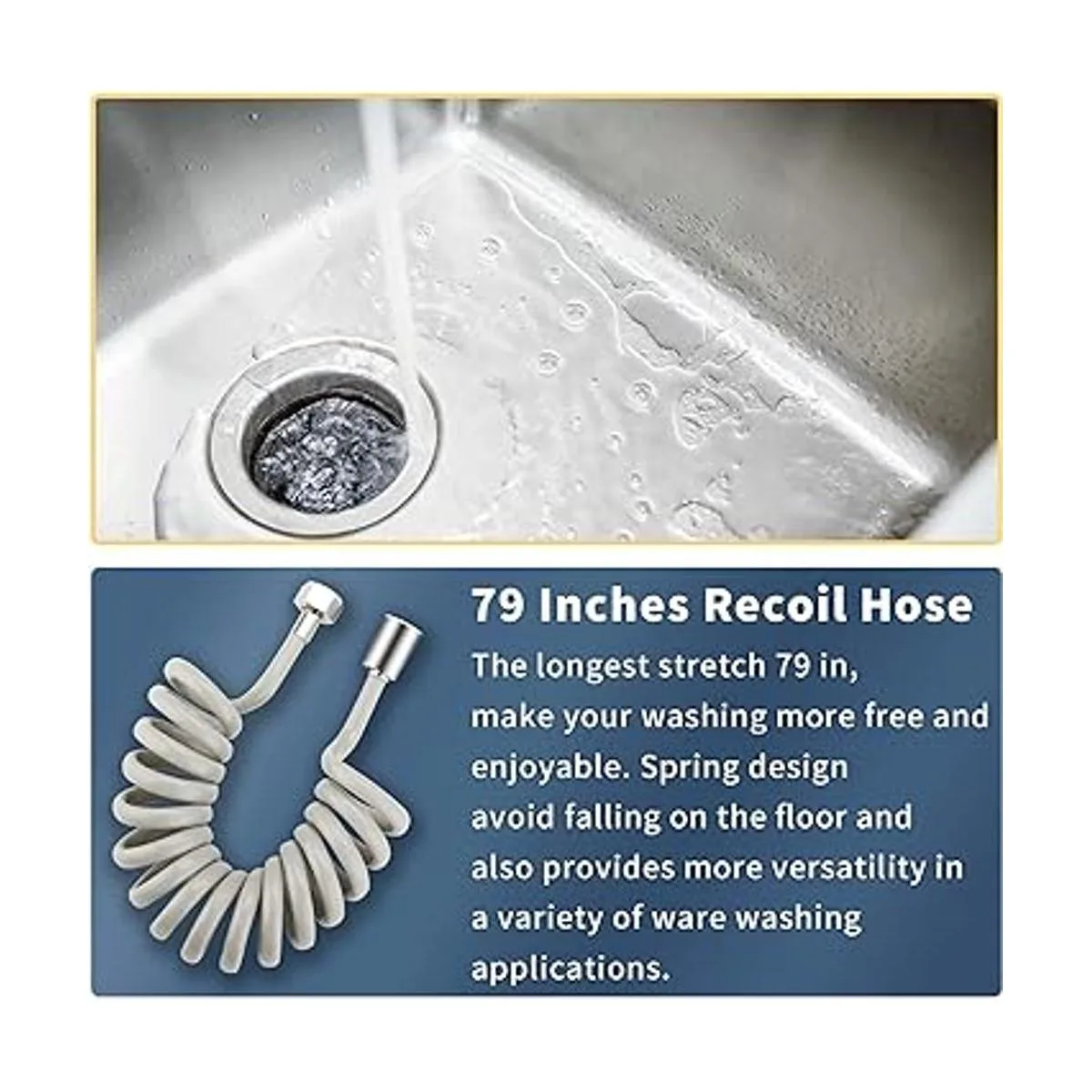 Manguera de resorte de 6.6 pies: la manguera telescópica elástica está hecha de material de alta calidad, no tóxico, a prueba de explosiones y antibobinado. El estiramiento más largo es de 6.6 pies, que se puede extender más allá del fregadero, fácil de limpiar artículos grandes o esquinas remotas. Manguera rociadora de grifo con diseño de resorte flexible para evitar que se caiga en el suelo, ahorra espacio y proporciona más comodidad