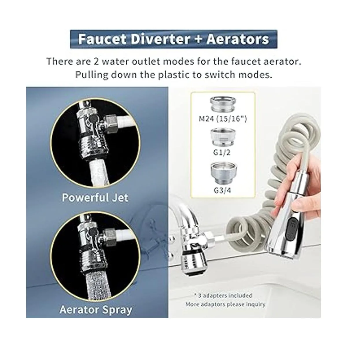 Aireador de grifo y desviador de 3 vías: diseño de 2 flujo de agua tirando hacia abajo del aireador, convierte el flujo de burbujas suave en spray fuerte. Válvula de construcción de latón con 1 entrada de agua y 2 salidas, redirige el agua desde la boquilla del grifo al pulverizador. Adaptadores incluidos: hembra de 0.866 in 27T en conector desviador, macho de 0.945 in 27T, adaptador G1/2 y G3/4 para grifo de utilidad/lavandería.