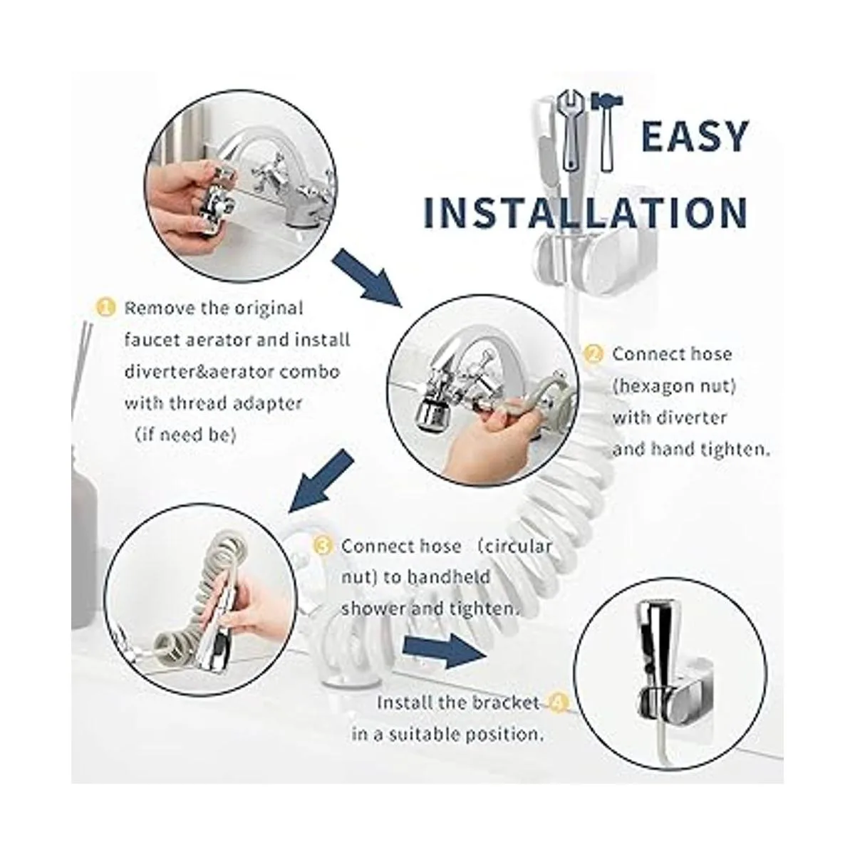 Fácil de instalar: no hay necesidad de llamar a un fontanero. Simplemente saca el aireador actual, conecta el aireador de grifo de doble función CECEFIN con válvula de 3 vías en el grifo, luego atornilla la manguera del bidé y el pulverizador de mano. Entonces puedes cambiar entre el aireador de grifo y el pulverizador de fregadero de mano. No dudes en ponerte en contacto con nosotros si tienes algún problema