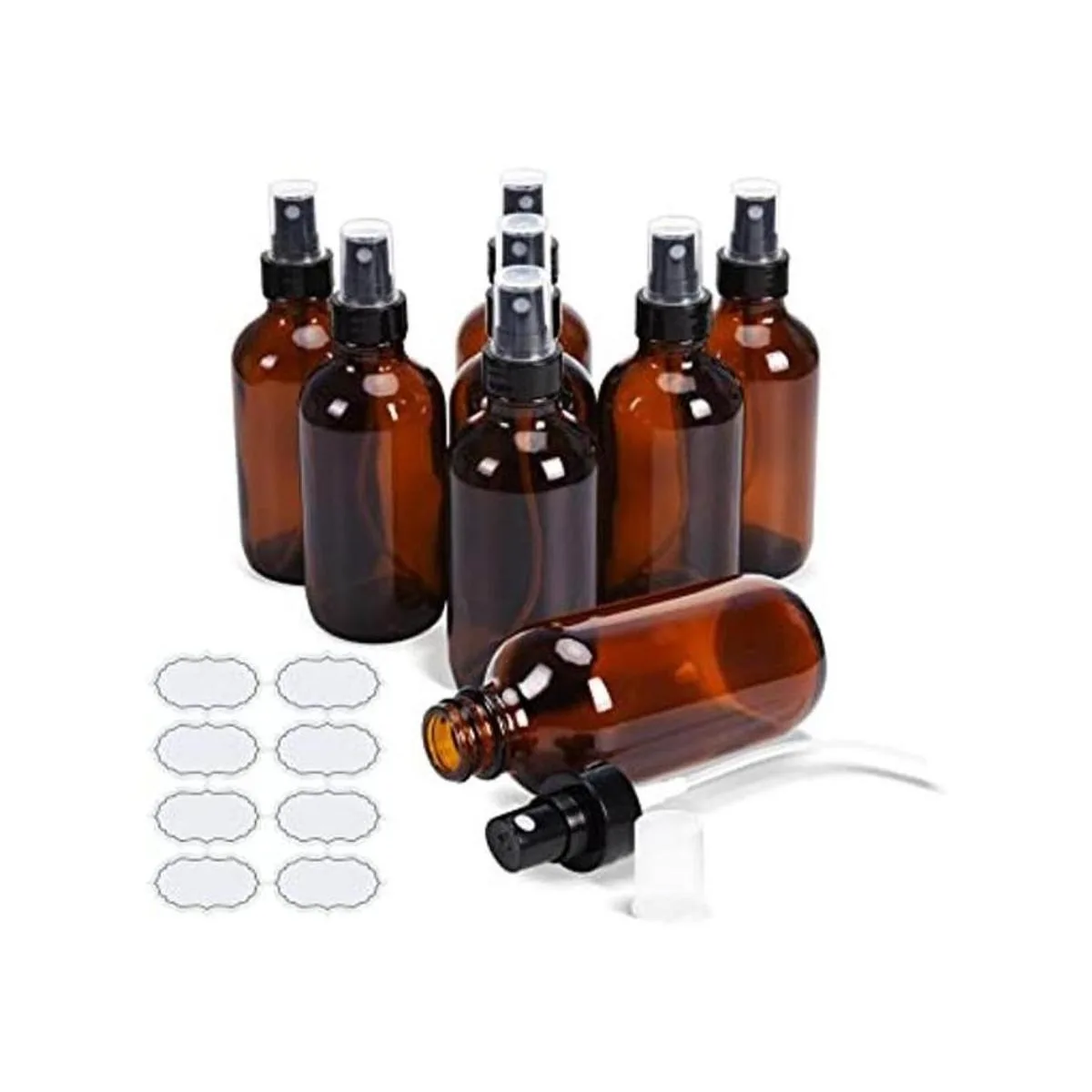 Pulverizadores de niebla fina 4 oz ámbar Boston, botellas de vidrio ULG, 8 piezas de atomizador vacío para aceites esenciales, aromaterapia, aerosoles cosméticos incluyendo etiquetas impermeables DIY