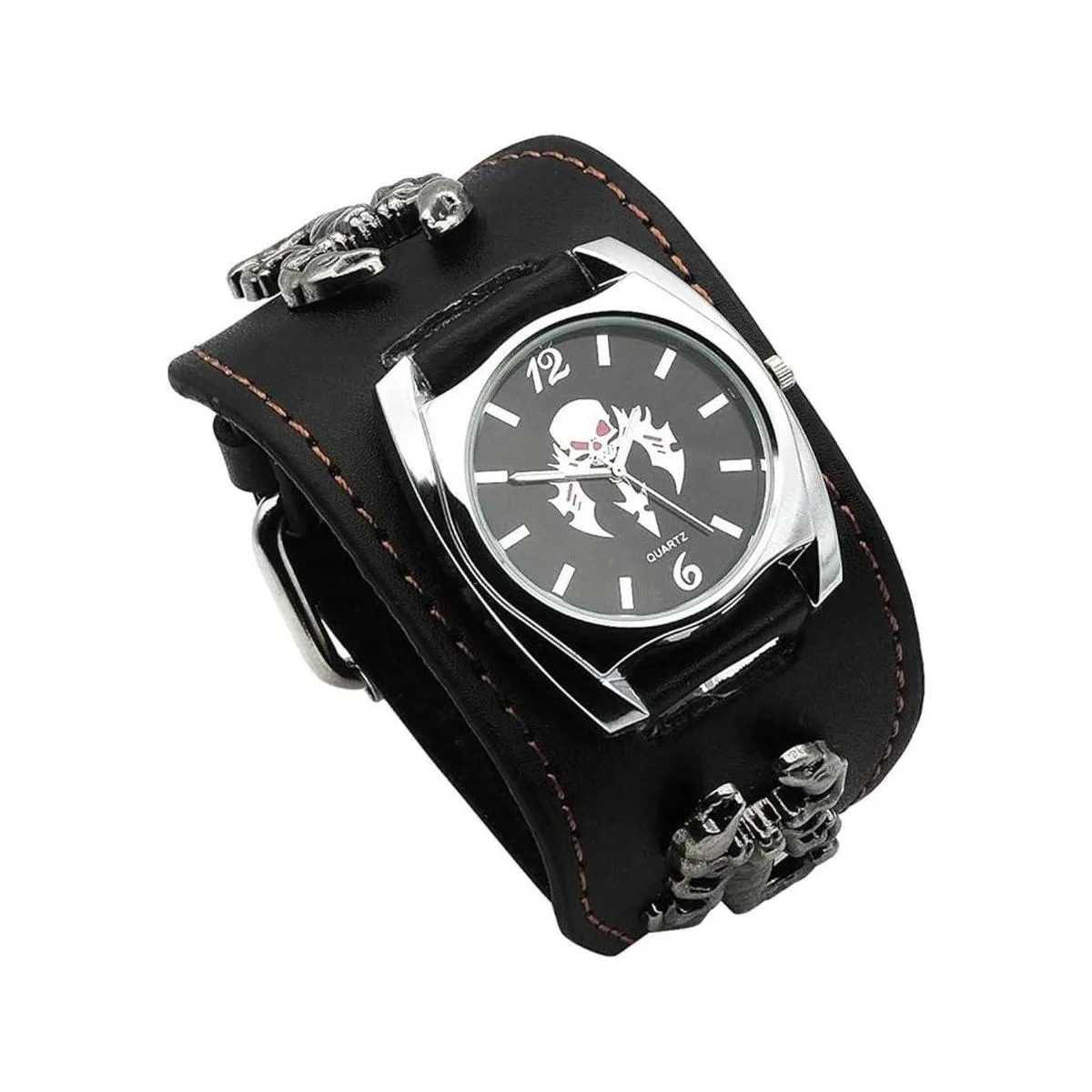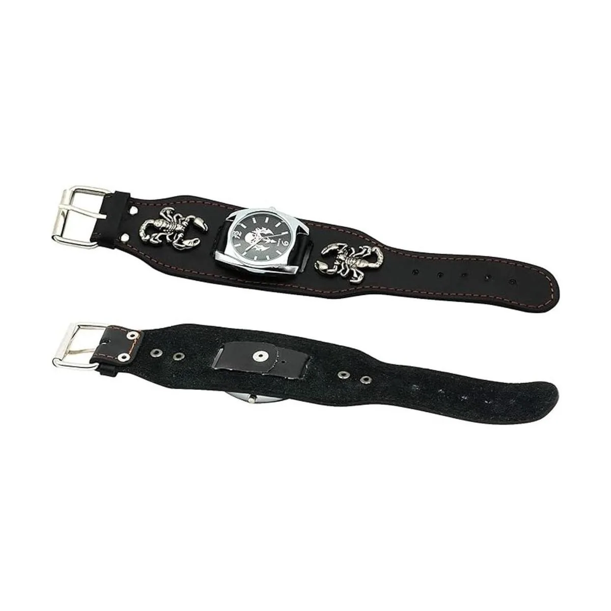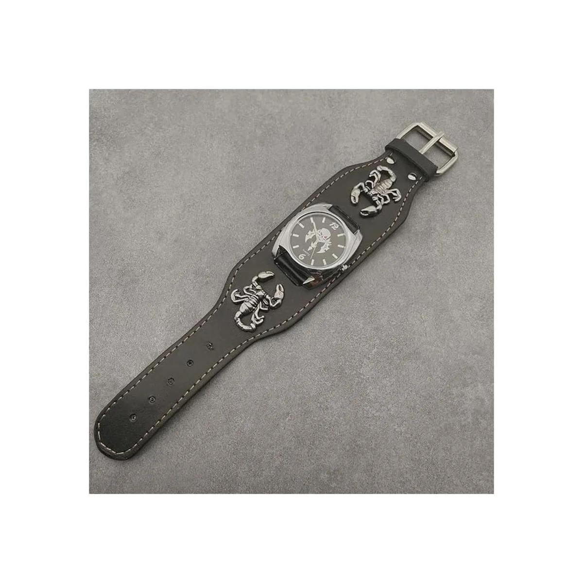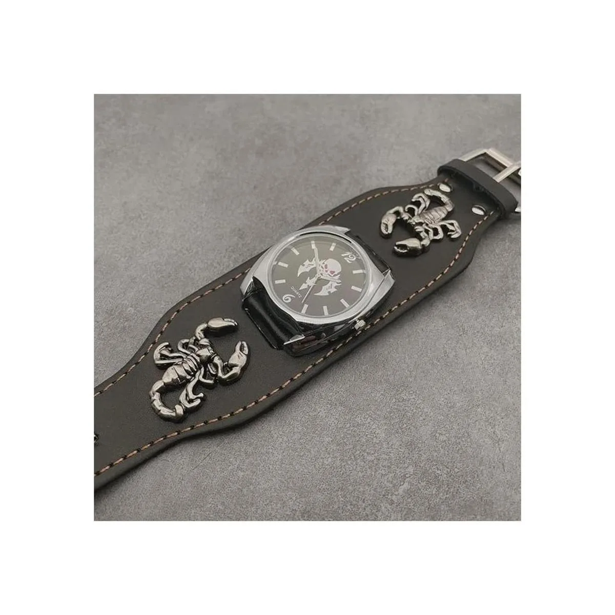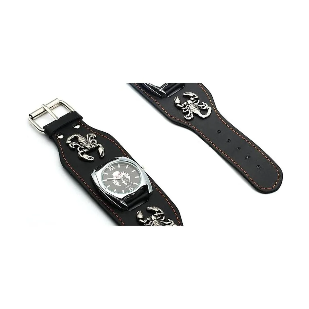 Punk Scorpion Reloj de pulsera con diseño de calavera para hombres y mujeres, color negro, de piel ancha, estilo fresco, reloj de locomotora rock