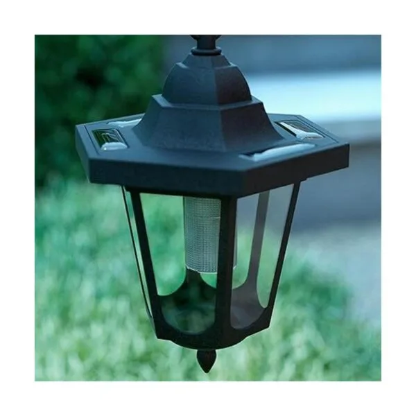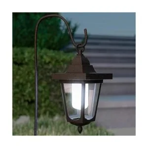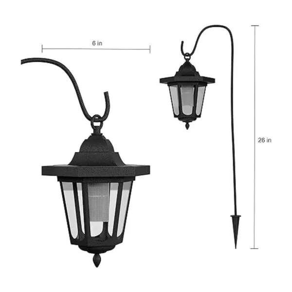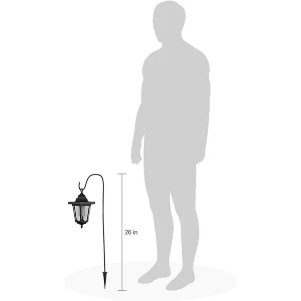 : altura: 26.0 in, altura por encima del suelo: 19.7 in. Material: base de plástico, ganchos de metal. Panel solar: policristalino, 2 V/60 mA. 6 lúmenes. Batería: recargable 1 x AA 1,2 V 600 mAh NiMH. Incluye 2 luces solares colgantes y ganchos de pastor.