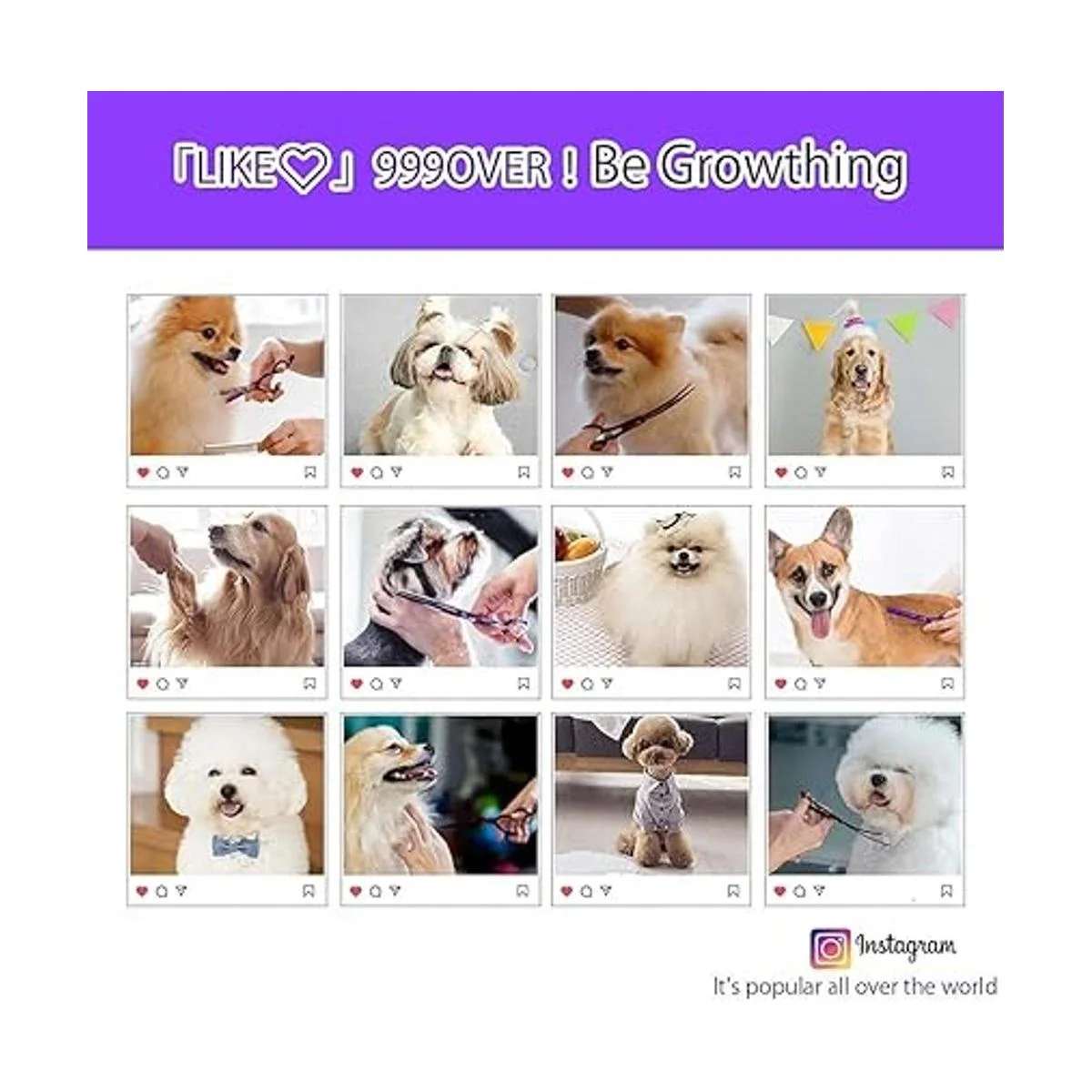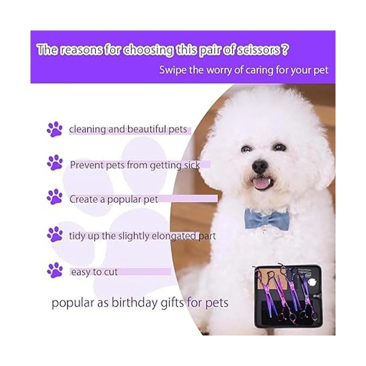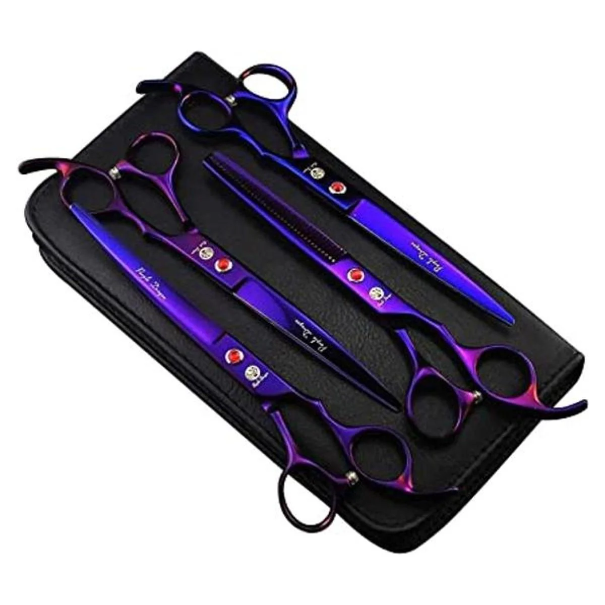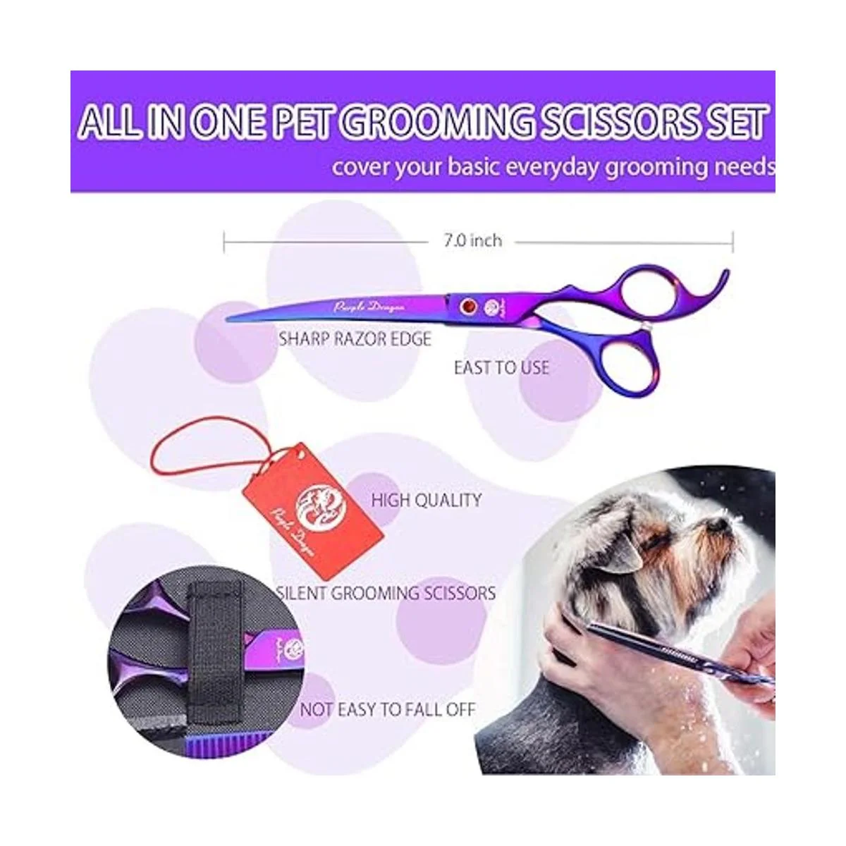 Purple Dragon Juego de 4 tijeras profesionales de aseo para mascotas de 7.0 pulgadas de acero de primera calidad japonés, rectas y curvadas y de adelgazamiento, con funda