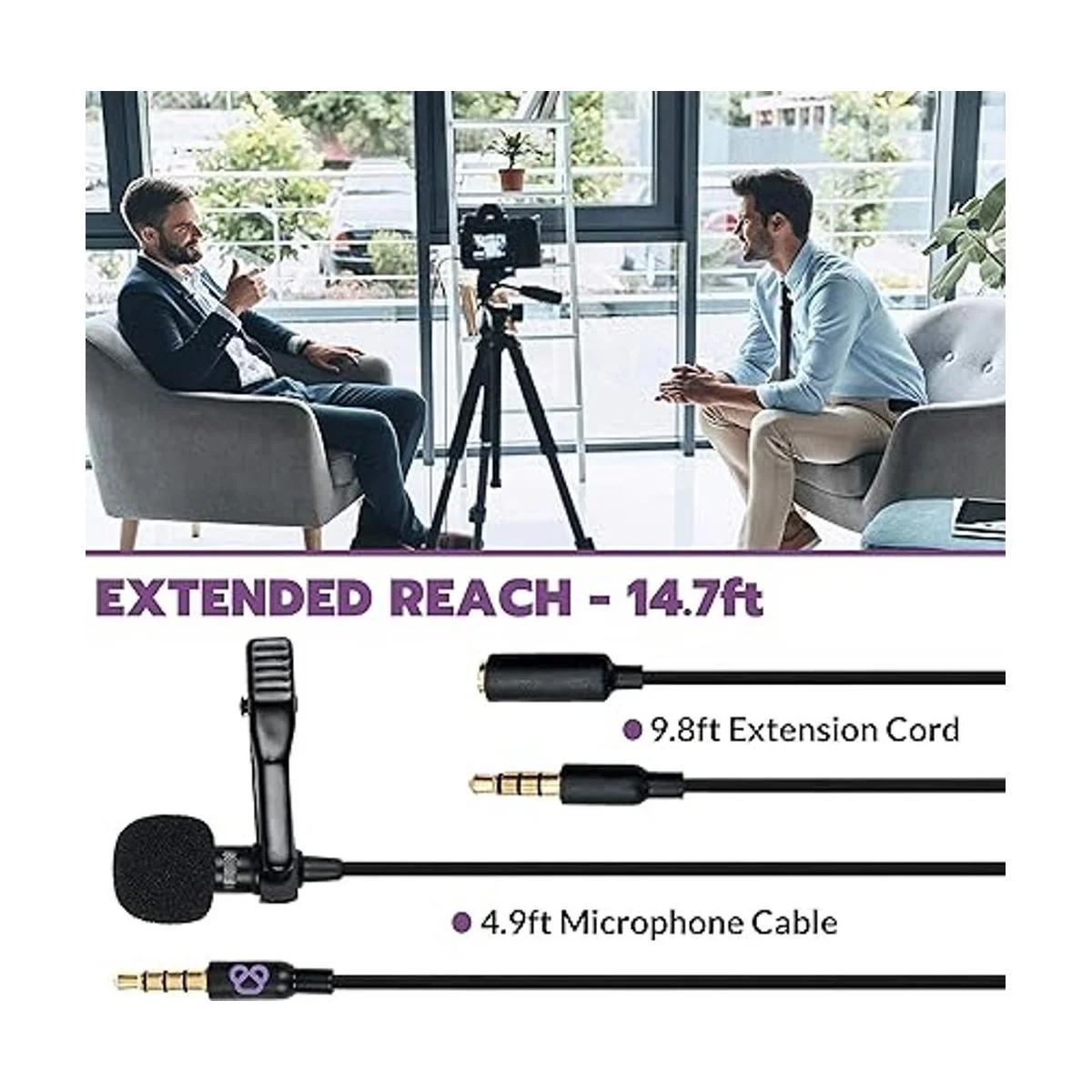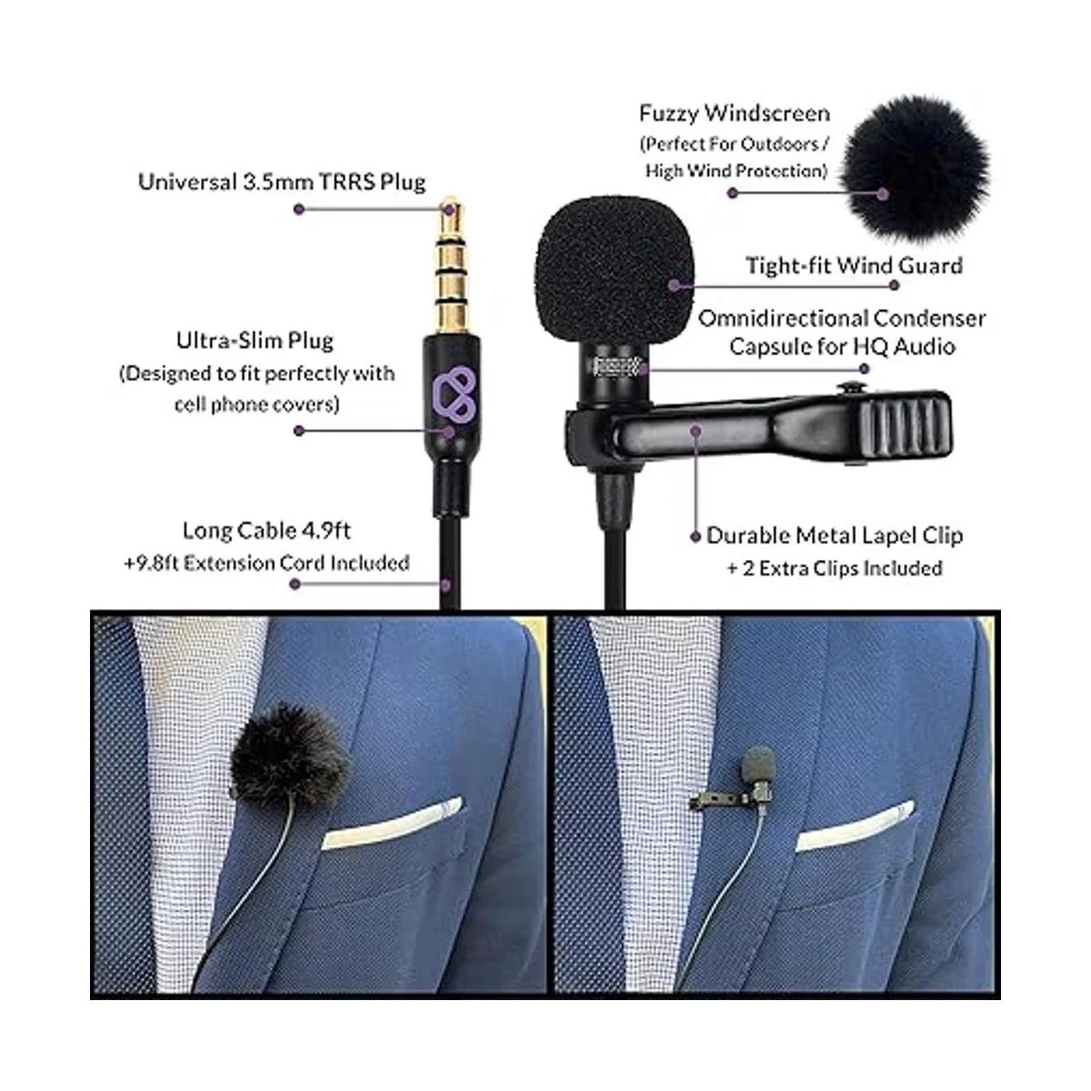 Paquete compacto 9 en 1; incluye 2 micrófonos Lavalier con cable de 4.9 pies y enchufe TRRS, 2 cables de extensión de 9.8 pies, adaptador TRS 2 anillos, divisor en Y 2 micrófonos en 1 dispositivo, 2 parabrisas peludos, 2 escudos de espuma, 4 clips de solapa duraderos, bolsa de transporte y mosquetón; este kit de micrófono Lav tiene todo lo que necesitas para audio de calidad profesional