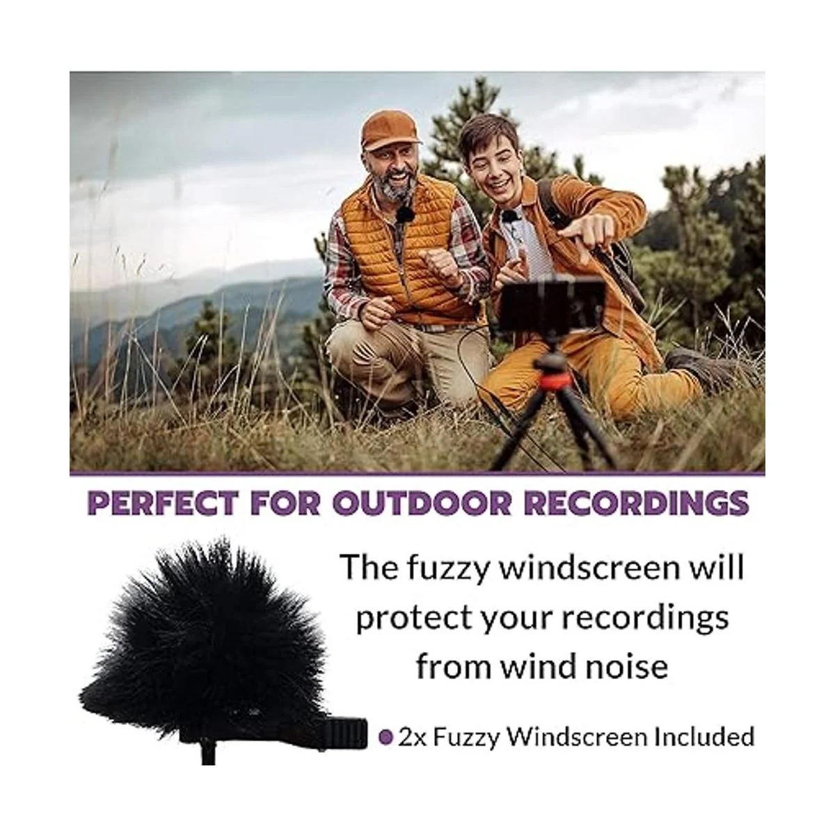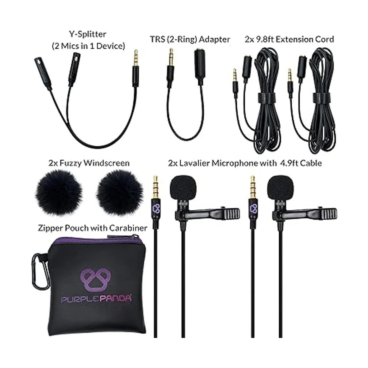 Purple Panda Kit de micrófono de solapa Lavalier de doble entrevista paquete de 2 para podcast, micrófono Lav con clip omnidireccional profesional, compatible con iPhone, Android, cámara DSLR, Samsung, Zoom, Tascam