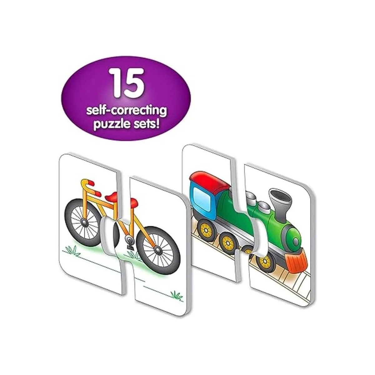 Este colorido conjunto de 15 tarjetas de rompecabezas proporciona a los niños con temática de vehículo una excelente introducción a sus cosas favoritas que van