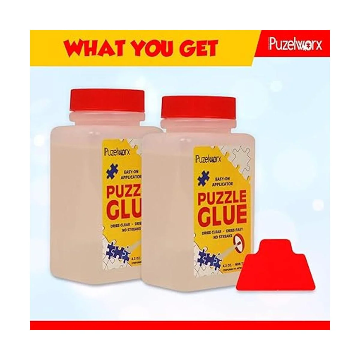PuzzleWorx Pegamento para rompecabezas, paquete de 2 aplicadores fáciles de poner, pegamento transparente no tóxico para rompecabezas de 100015002000 piezas, 4.2 onzas cada botella total 8.4