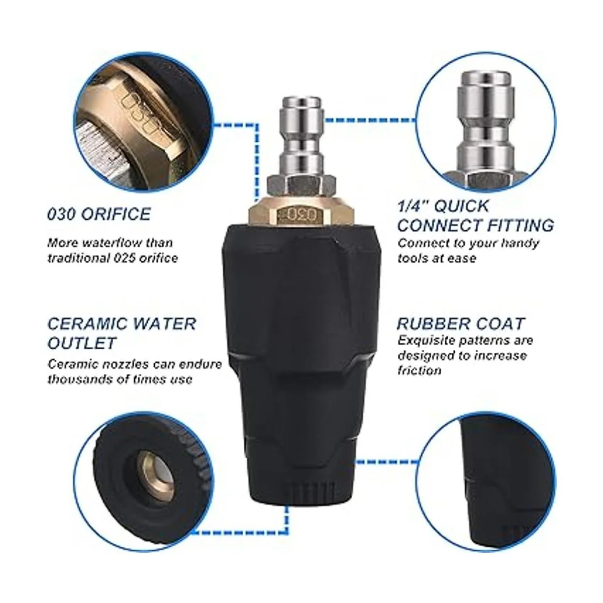 Fácil combinación: la boquilla giratoria tiene un ajuste universal de conexión rápida de 1/4 pulgadas, que es compatible con la mayoría de s o varitas de lavado a presión. La presión máxima de trabajo puede nivelar hasta 3600 psi, se adapta bien a la mayoría de marcas de lavadora eléctrica.