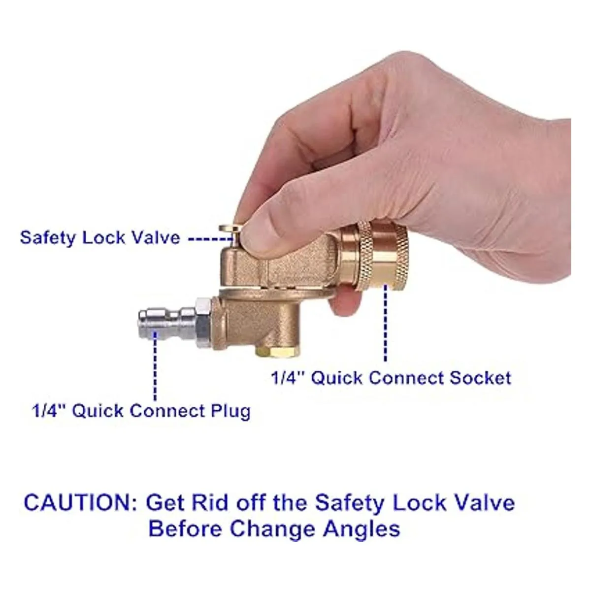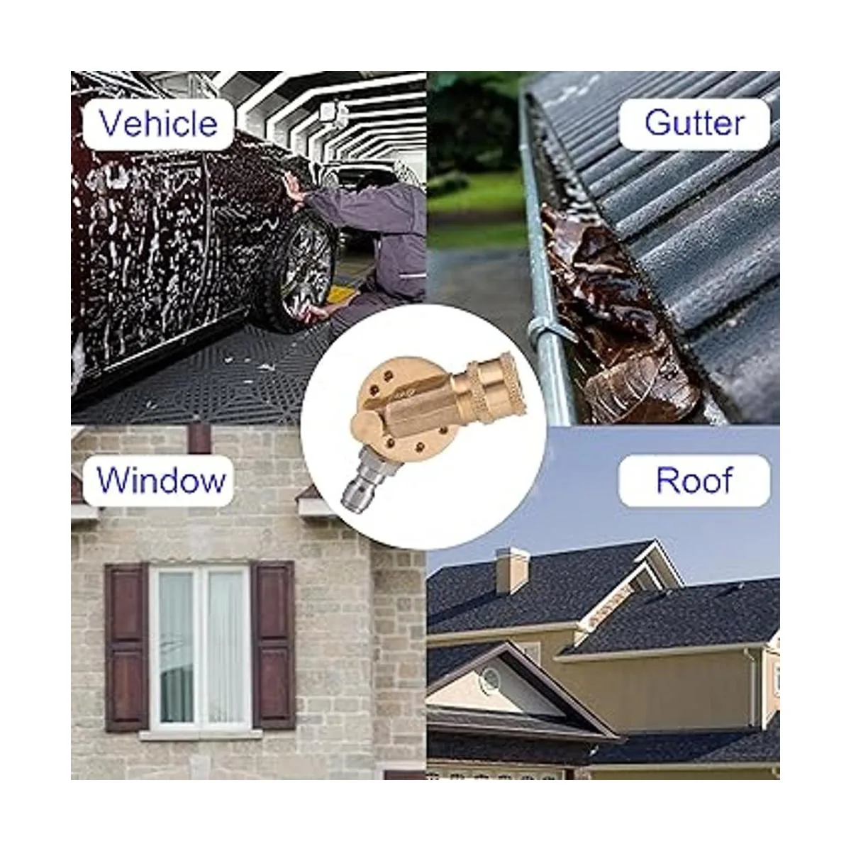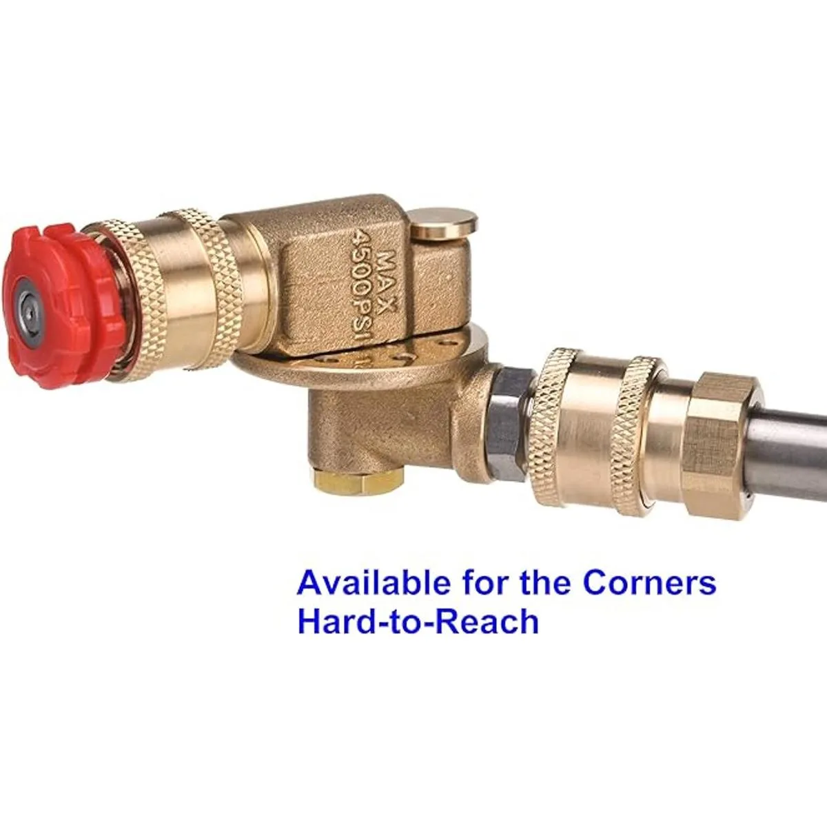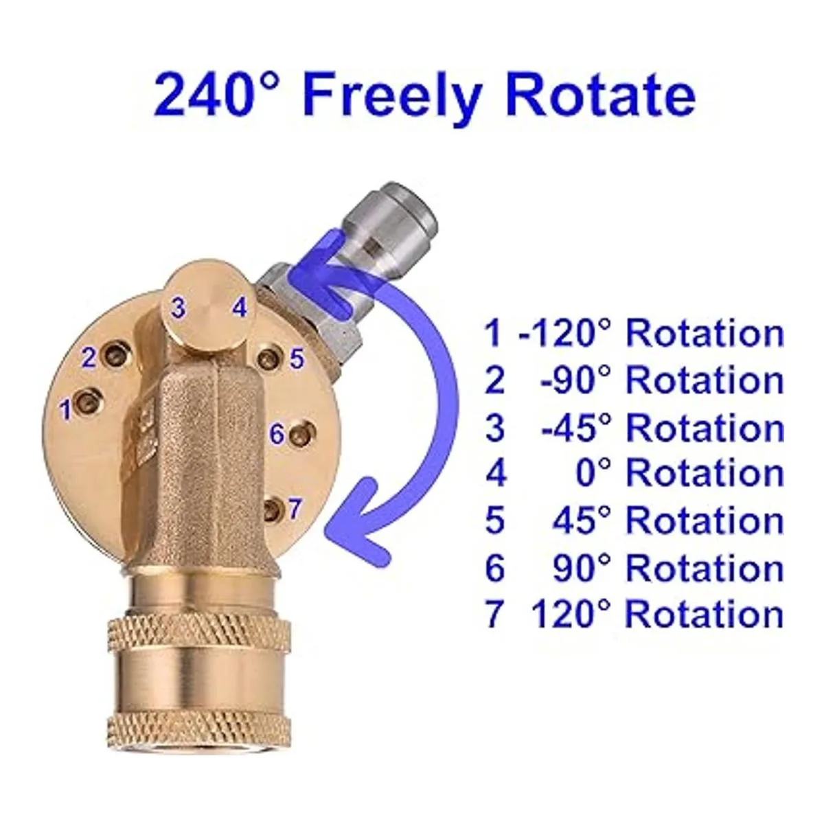 Diseño humano: el acoplador giratorio para lavadora a presión tiene 7 ángulos de rotación 120, 90, 45, 0, 45, 90, 120 para satisfacer las necesidades diarias de limpieza. El ángulo ajustable reduce la dependencia de otras herramientas, evitando gatear debajo del coche o subir la escalera superior.