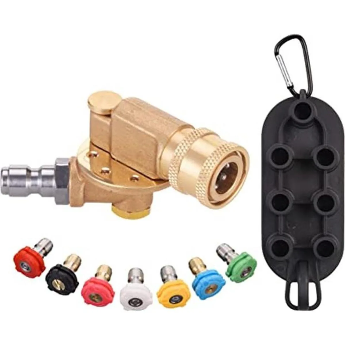 PWACCS Kit de acoplador giratorio de lavadora a presión, rotación de 240 grados, kit de accesorios de lavadora a presión que incluye accesorio limpiador de canalones y 7 puntas de boquilla de pulverización con soporte, conexión rápida de 14 pulgadas, 4500 PSI