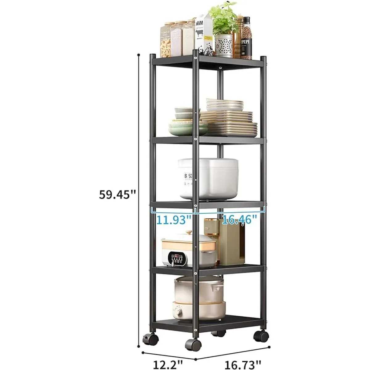 Resistente y duradero: estos estantes de almacenamiento resistentes de 5 niveles están hechos de acero al carbono de alta calidad, que es una durabilidad y resistencia superiores. La carga máxima estática total es de aproximadamente 450 libras. El estante organizador de estantes de cocina está recubierto de polvo negro para evitar arañazos y manchas.