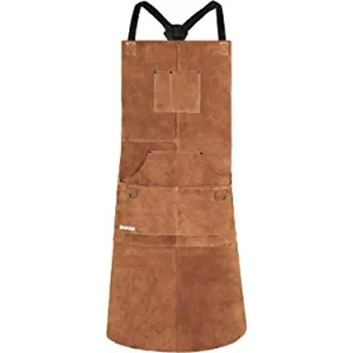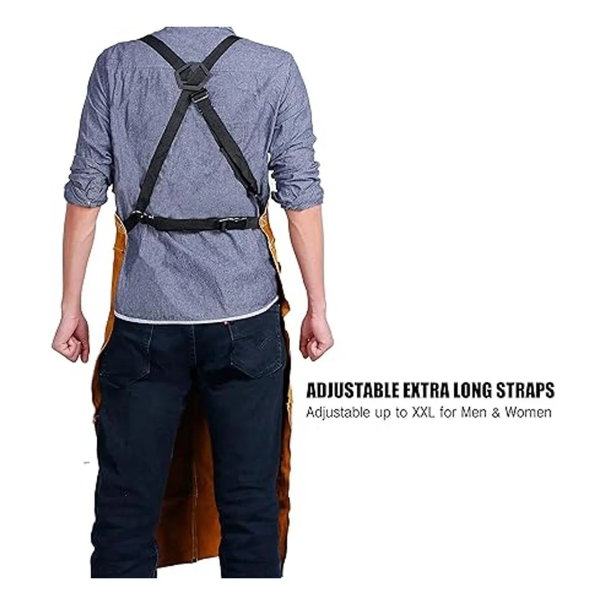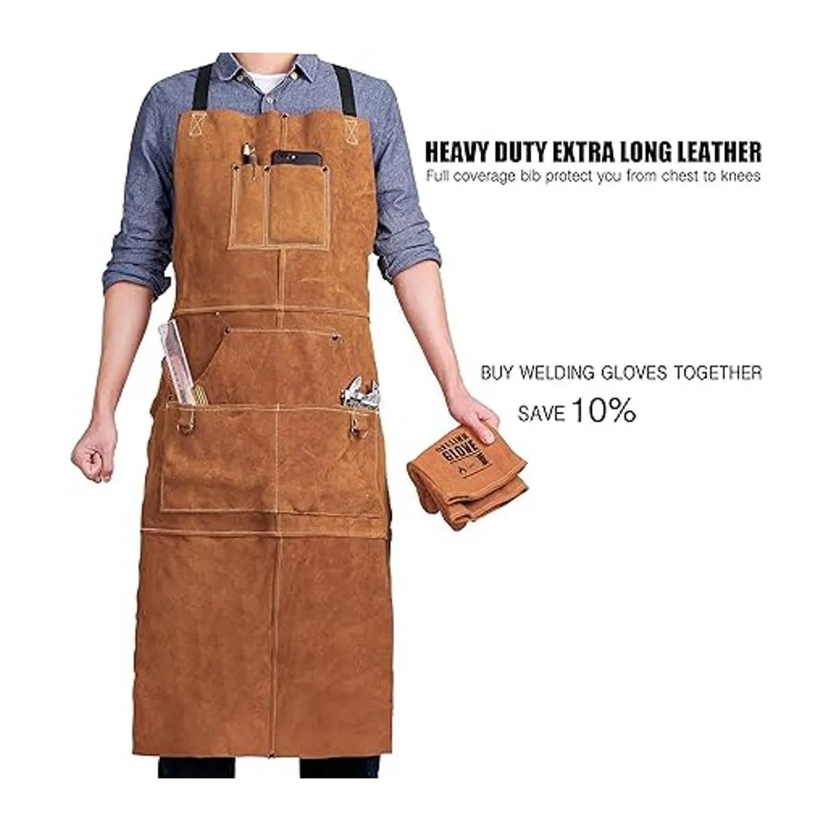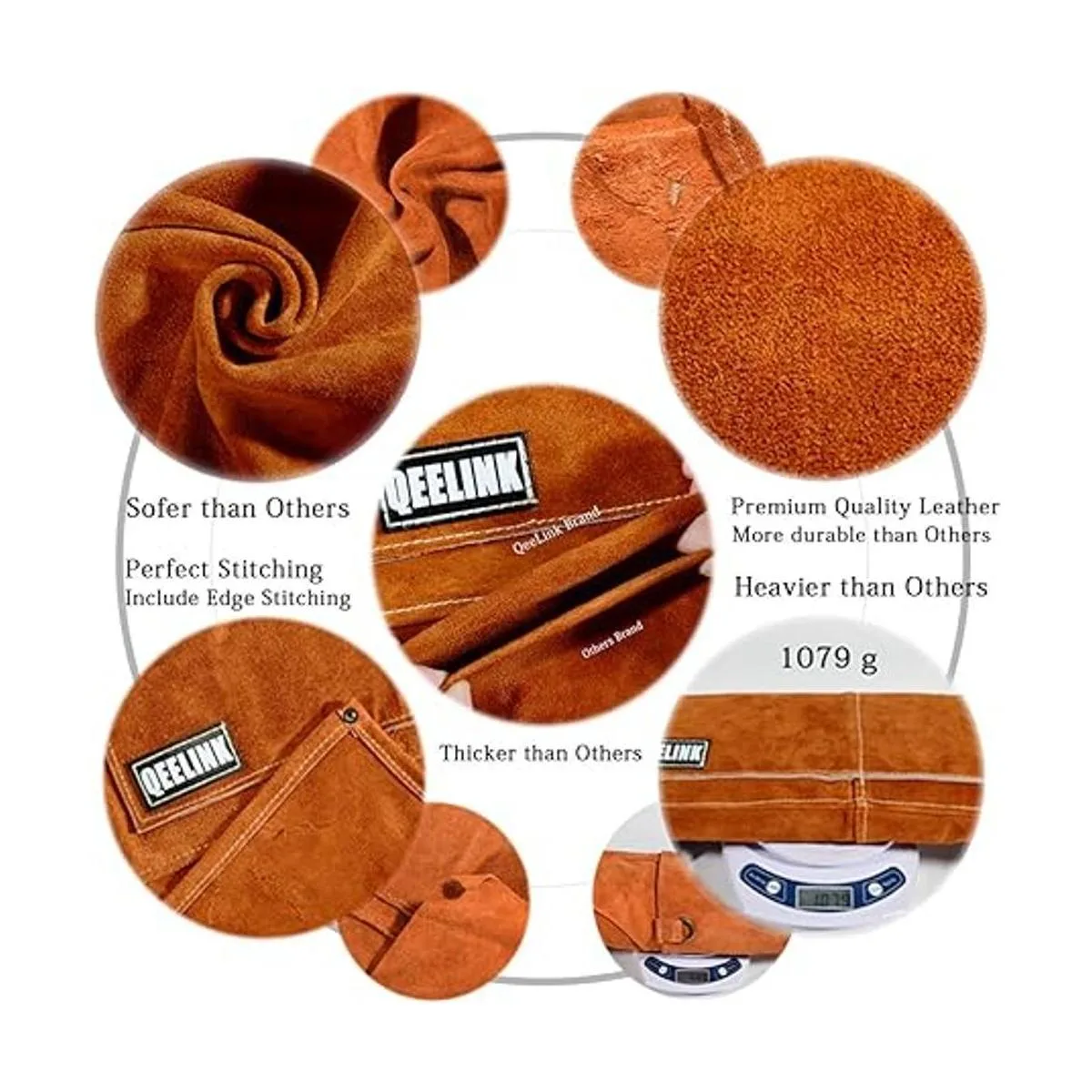 Protección superior: delantal de soldadura de cuero vacuno dividido resistente al calor y al fuego. Delantal extra largo 24 pulgadas de ancho x 42 pulgadas de alto de cobertura completa que te protege hasta la rodilla cuando estás trabajando.