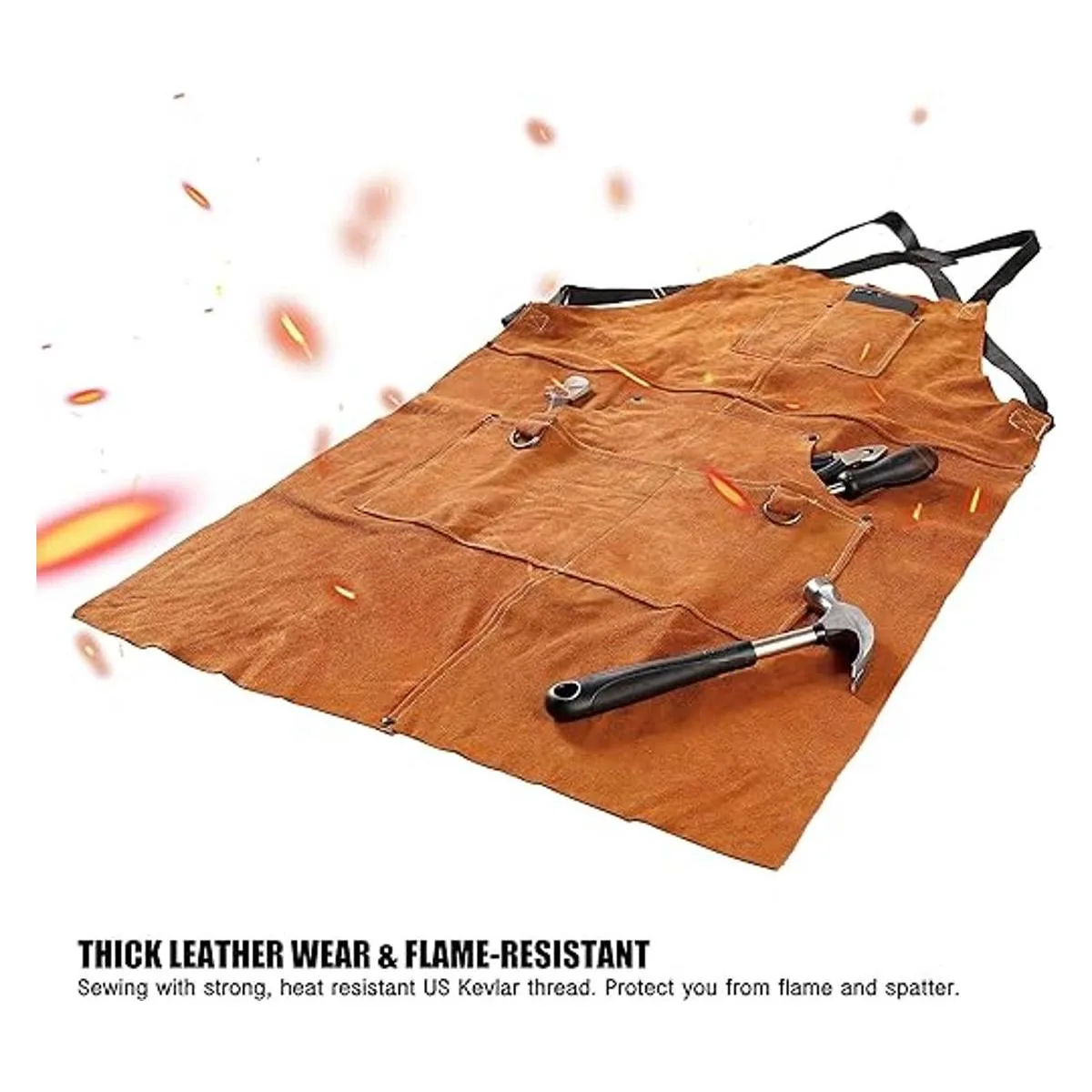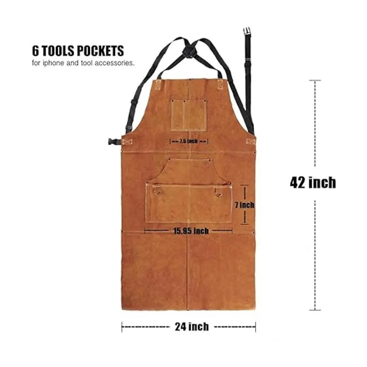 QeeLink Delantal de soldadura de cuero con 6 bolsillos, delantal resistente al calor y al fuego, 24 x 42 pulgadas, ajustable M a XXXL