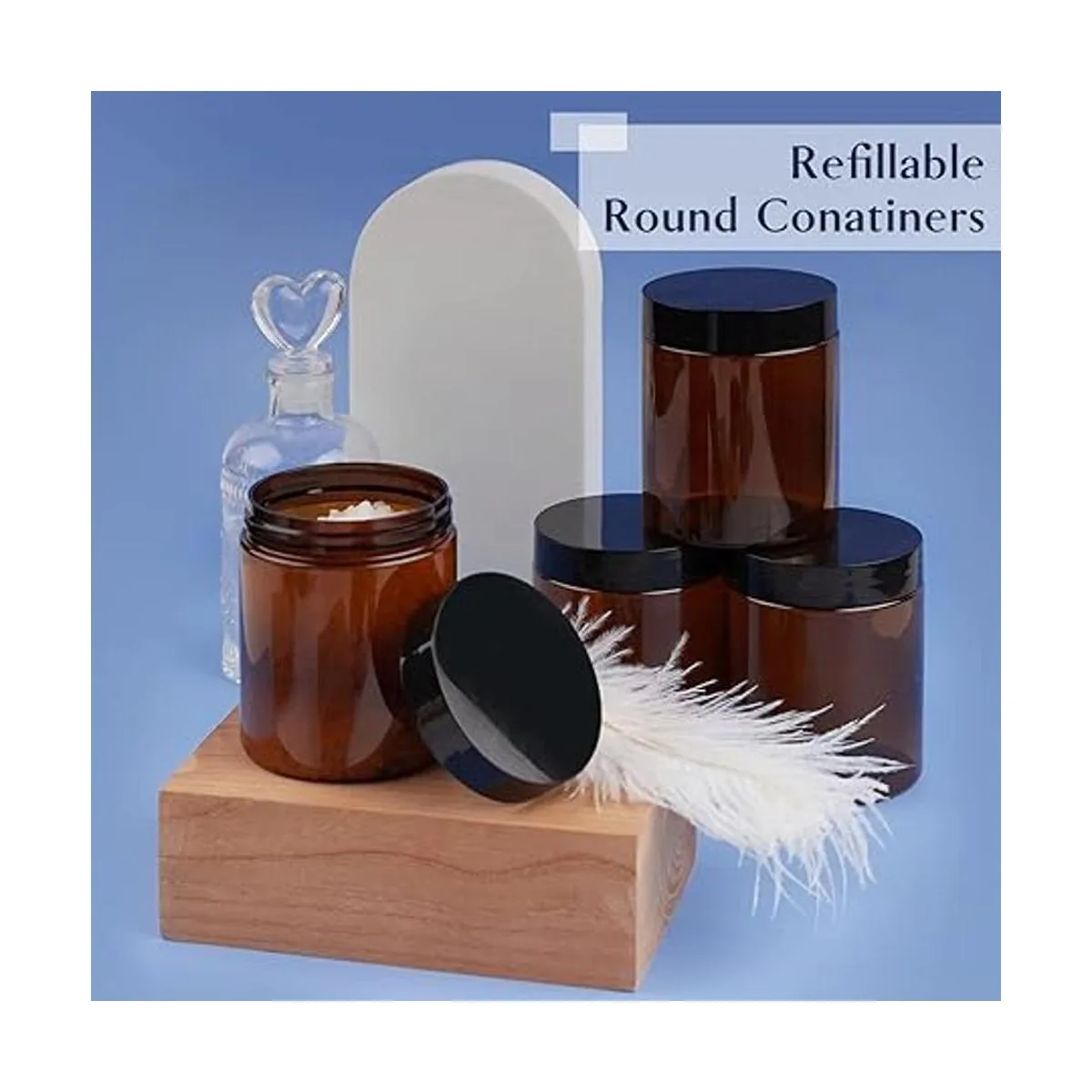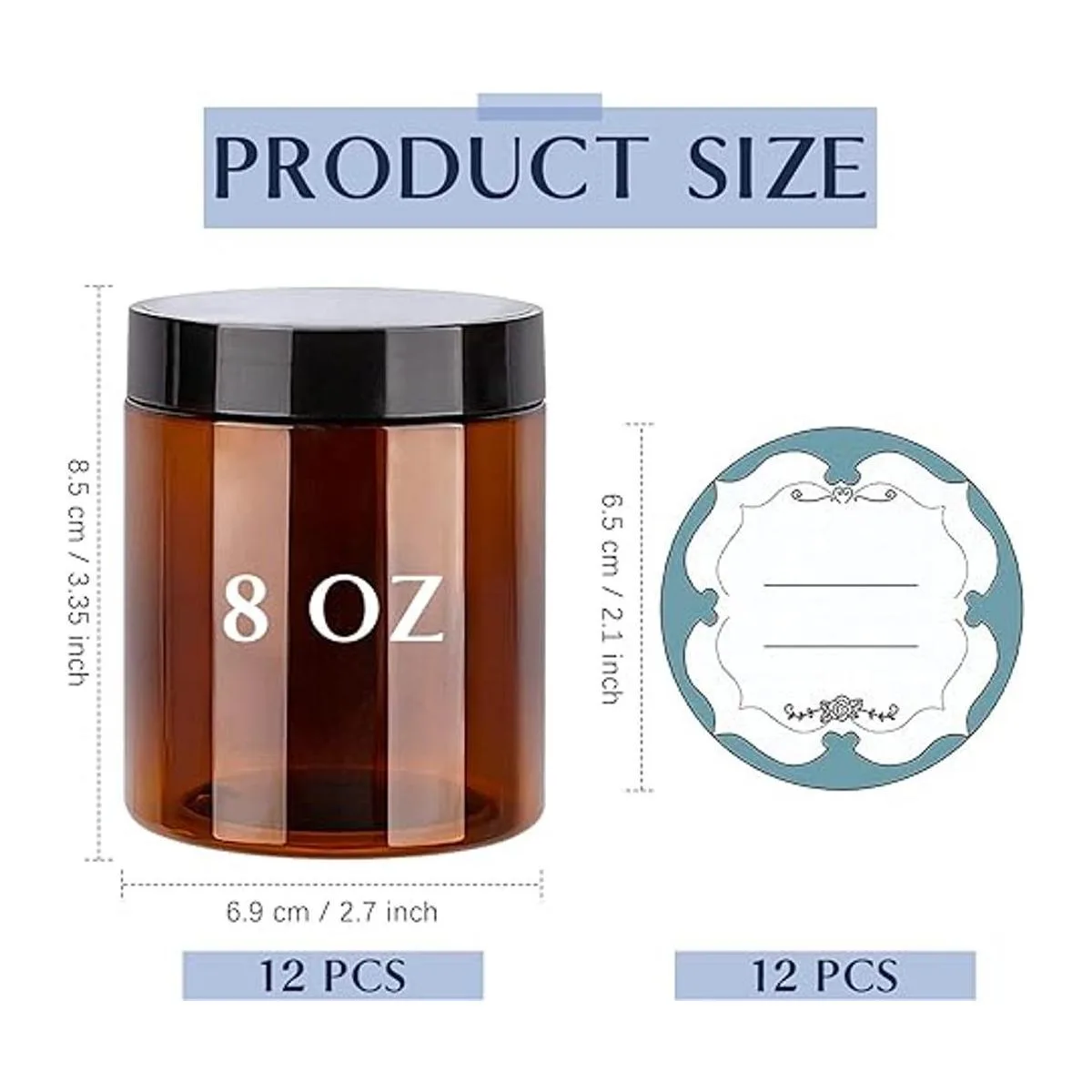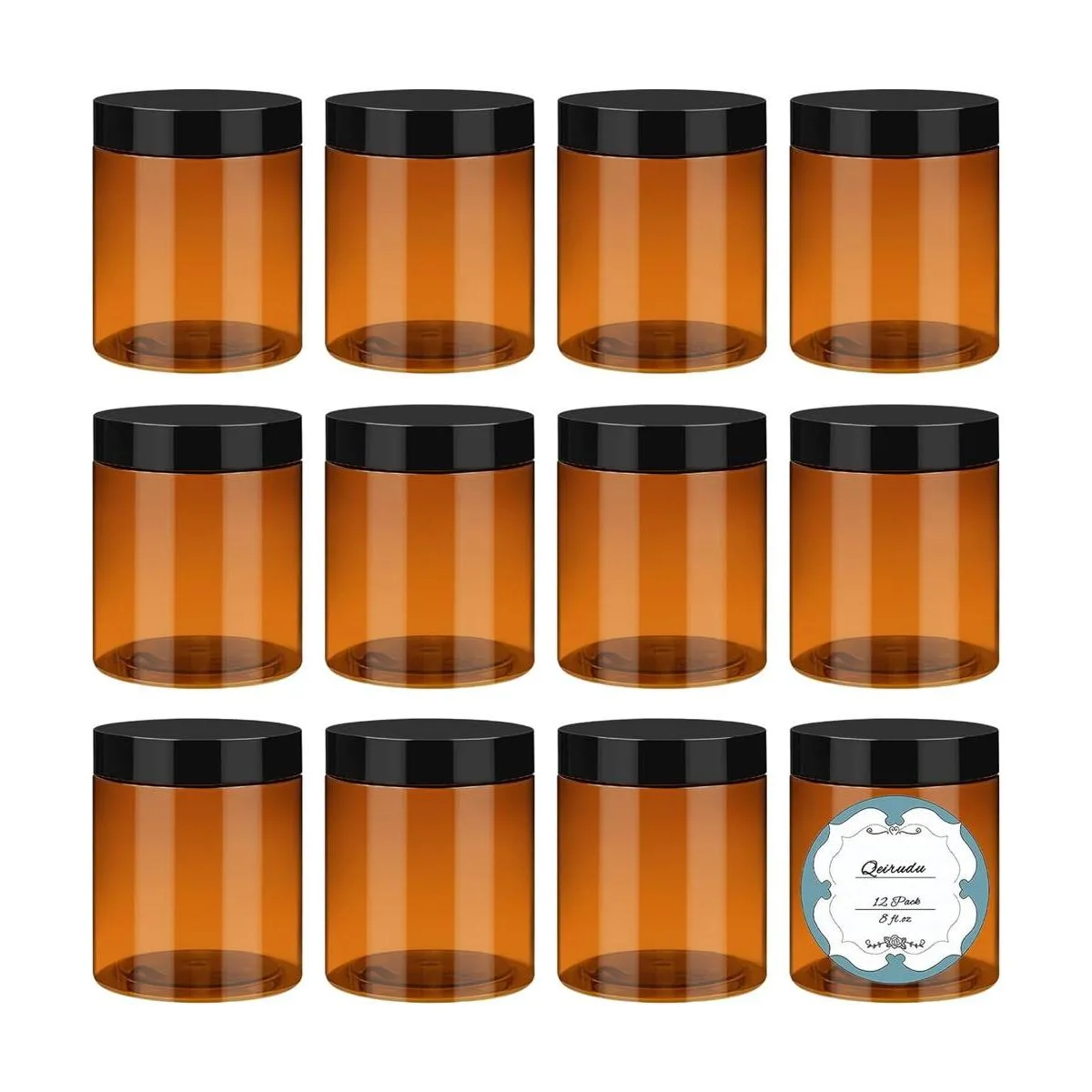 Qeirudu Tarros de plástico ámbar de 8 onzas con tapas y etiquetas, paquete de 12 recipientes de cosméticos redondos vacíos recargables para mantequilla corporal, cremas, loción, aceite esencial, polvos, ungentos