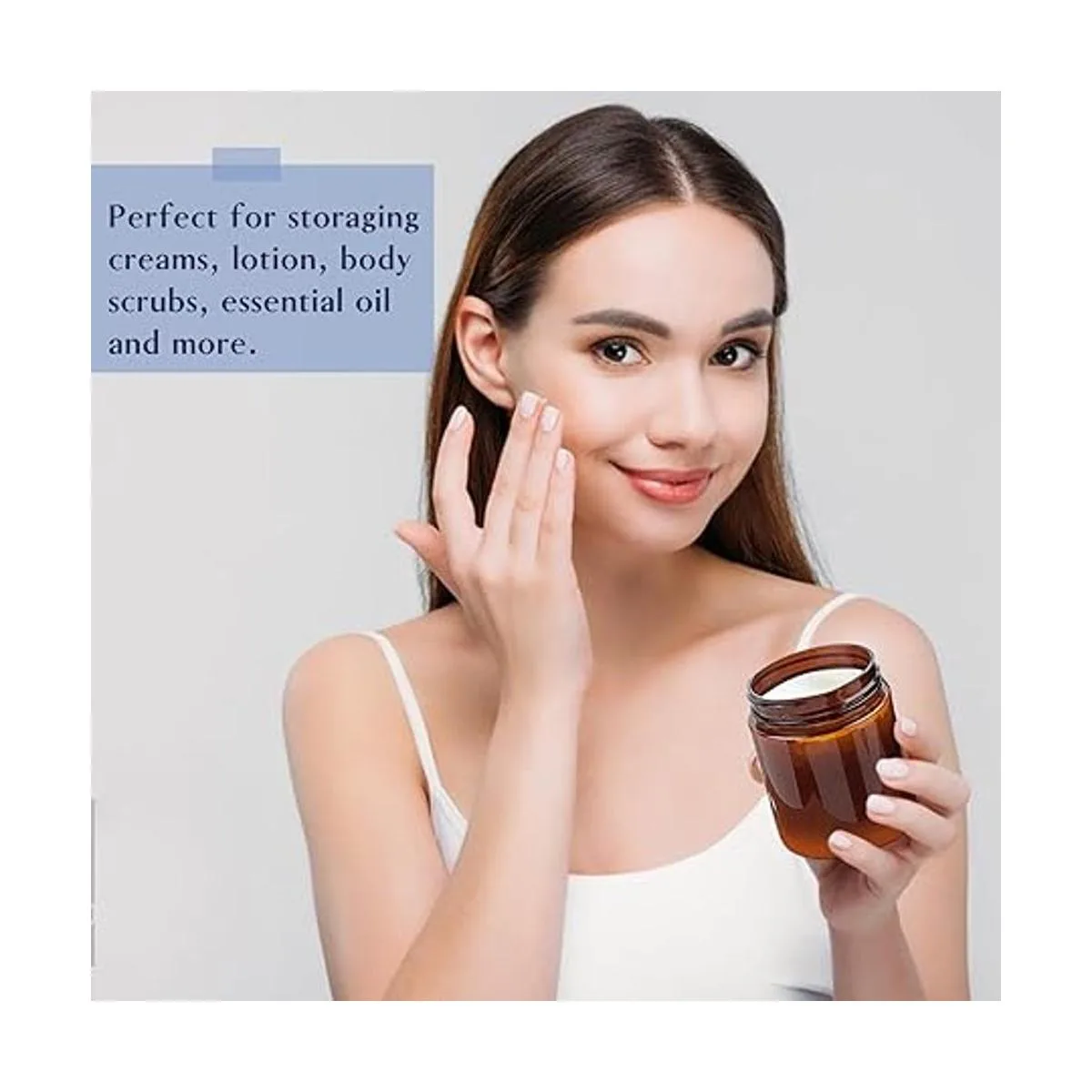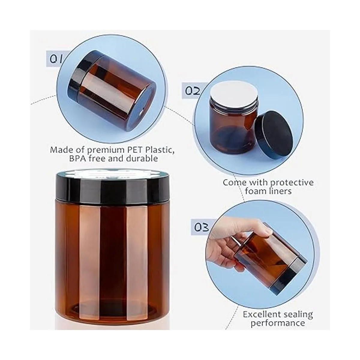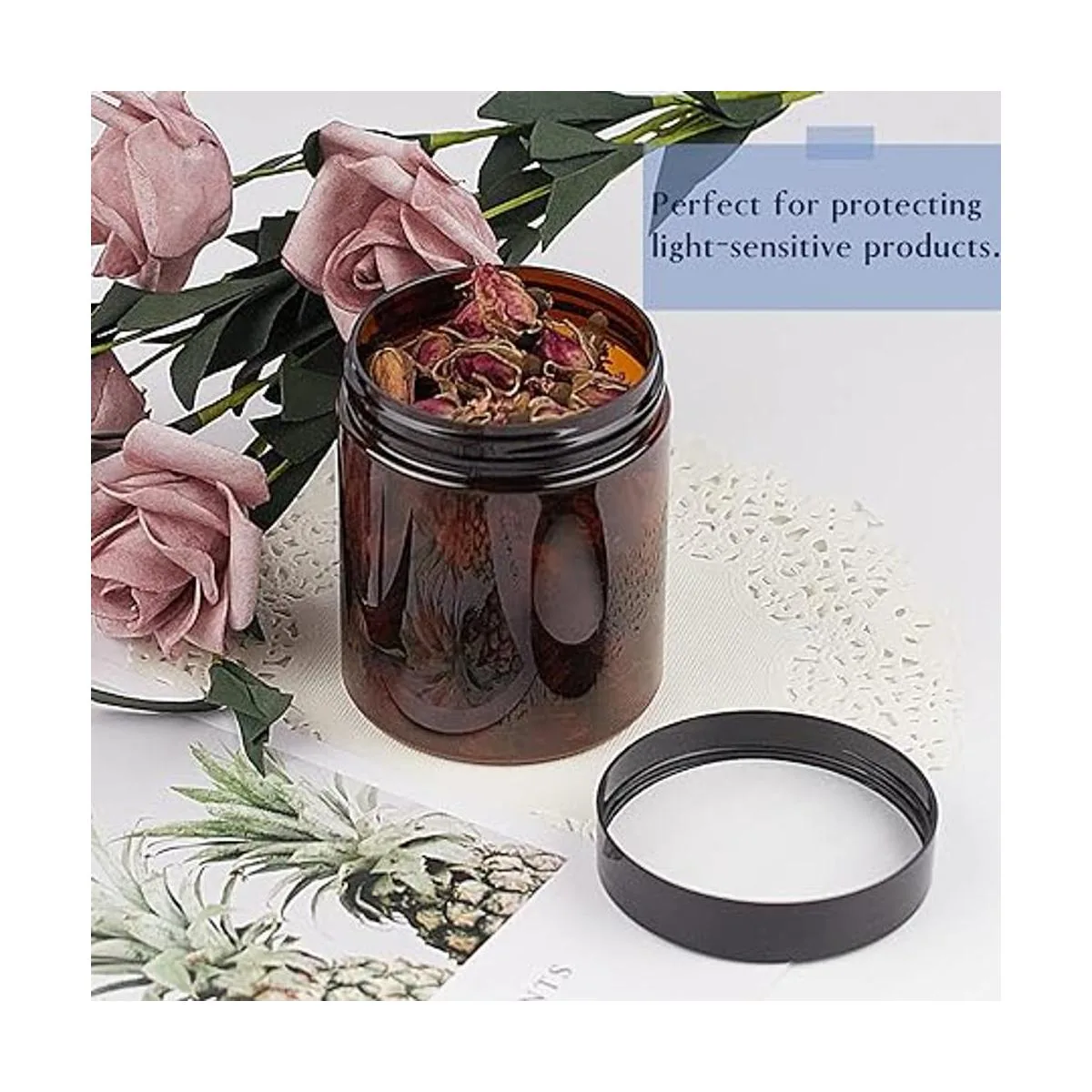 Qeirudu Tarros de plástico ámbar de 8 onzas con tapas y etiquetas, paquete de 12 recipientes de cosméticos redondos vacíos recargables para mantequilla corporal, cremas, loción, aceite esencial, polvos, ungentos