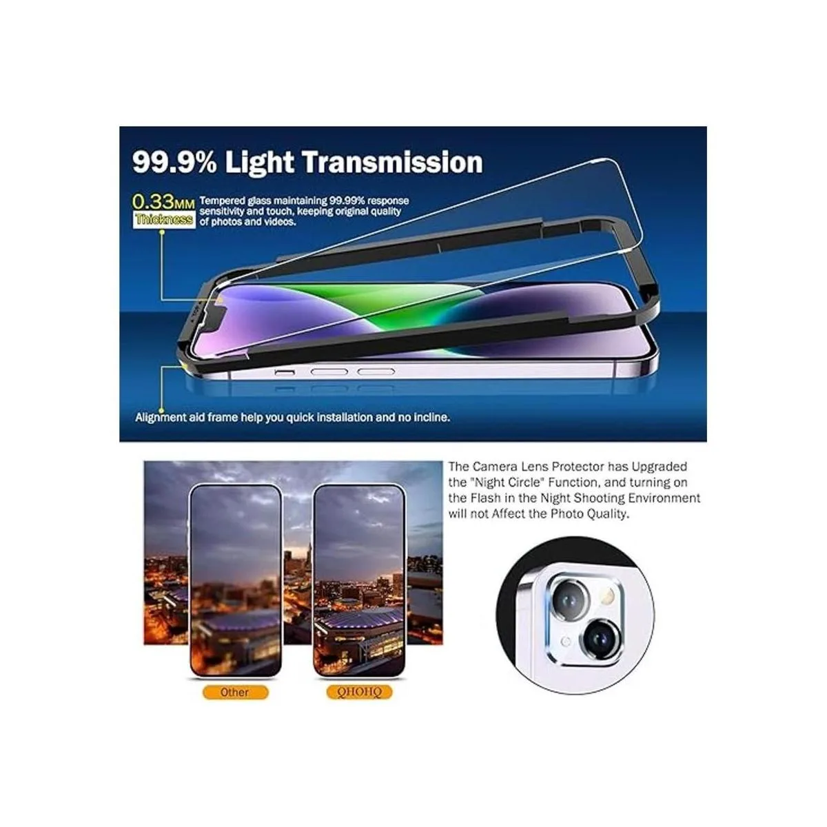 QHOHQ Paquete de 3 protectores de pantalla para iPhone 14 Plus de 6.7 pulgadas con paquete de 3 protectores de lente de cámara de vidrio templado, Ultra HD, dureza 9H, compatible con fundas marco fácil de instalar