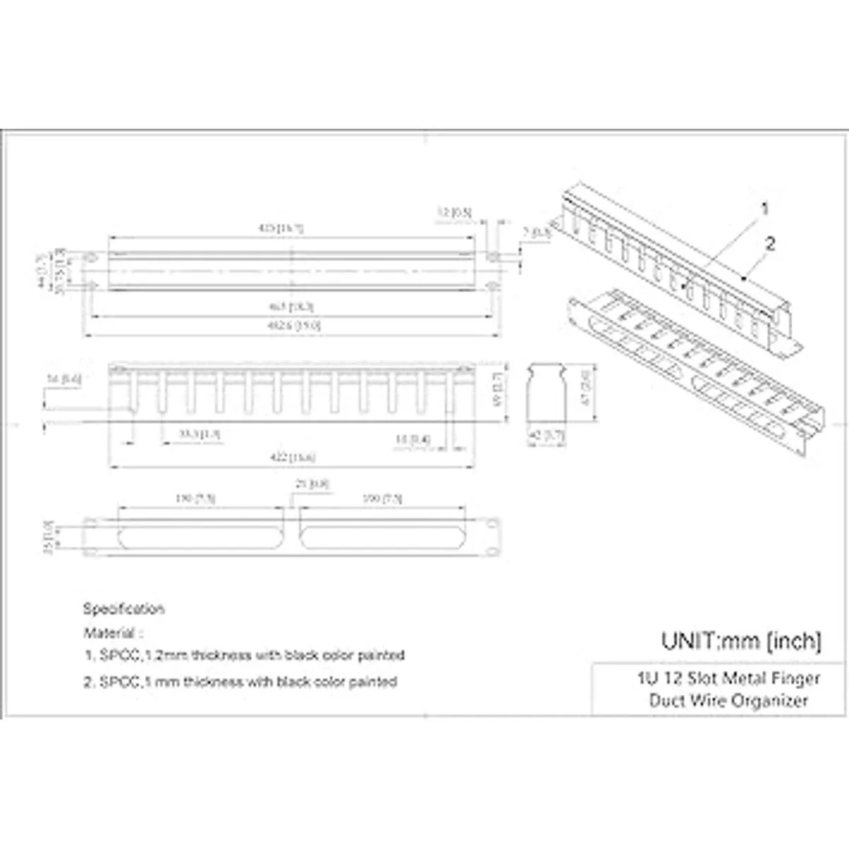 Tamaño del producto: 1.75 pulgadas de alto x 2.72 pulgadas de profundidad x 19 pulgadas de ancho, 12 ranuras grandes, ancho de cada ranura: 0.4 pulgadas; cabe en cualquier soporte estándar de 19 soportes, armario de servidor, estante y mucho más.