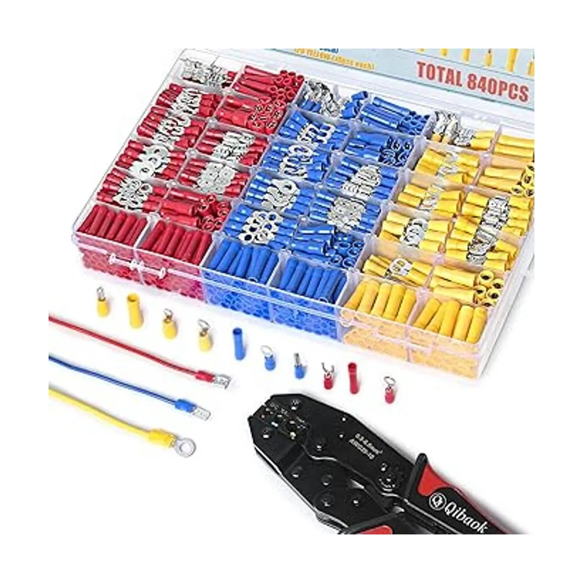 Qibaok 840 conectores de cable eléctrico, terminales de crimpado de cable aislados, kit surtido de desconexión rápida de horquilla mixta de anillo de tope