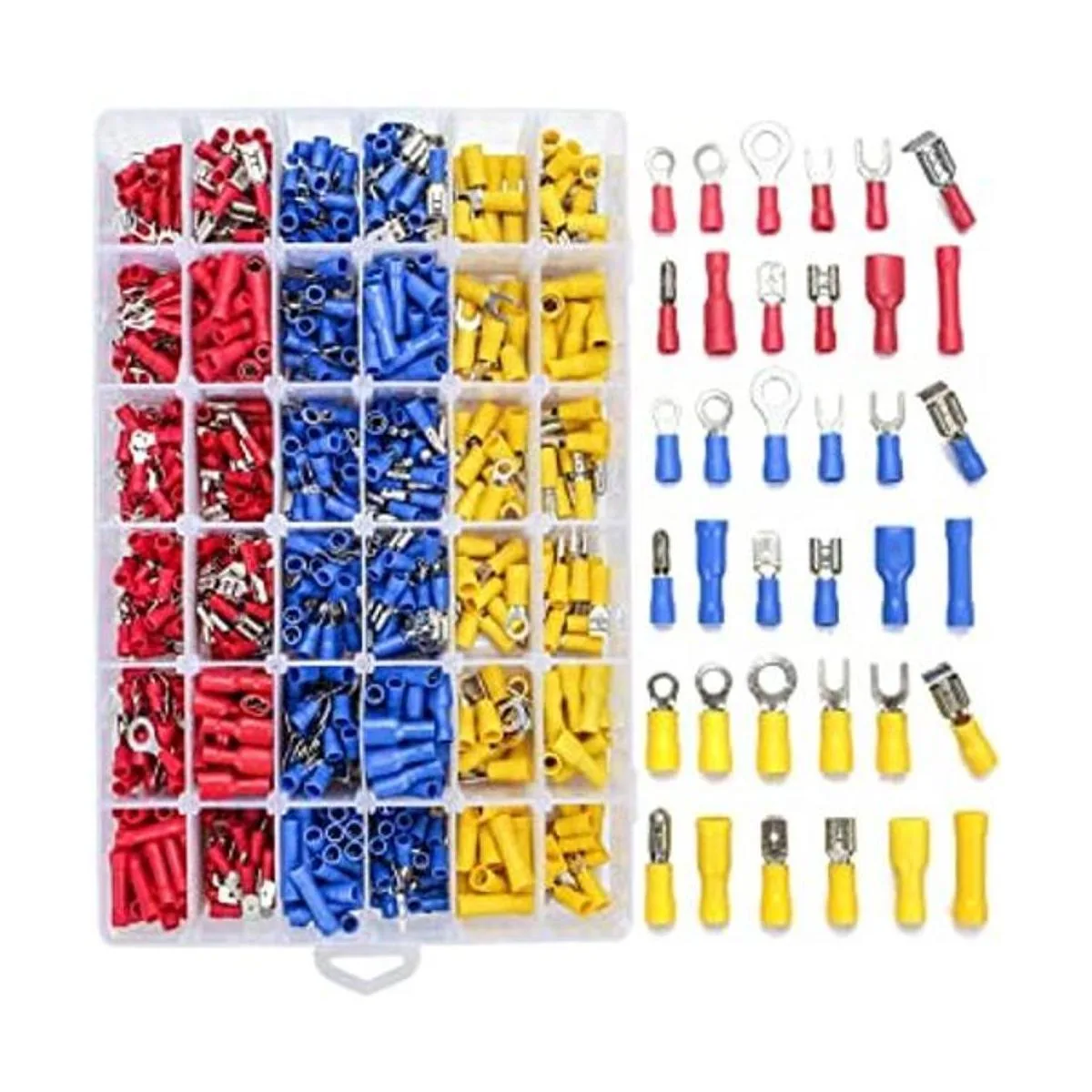 El paquete incluye: 840 terminales de alambre: anillos, tenedores, colillas, palas macho semiaisladas, palas hembra semiaisladas, palas hembra totalmente aisladas, balas macho, balas hembra, conectores de terminal de crimpado trasero de cerdito.