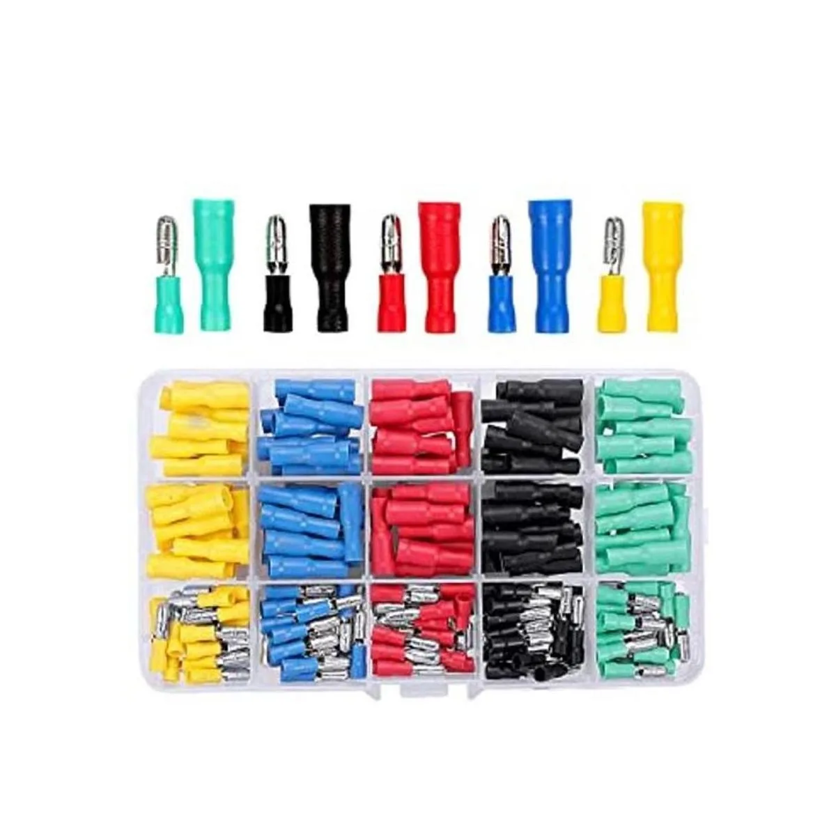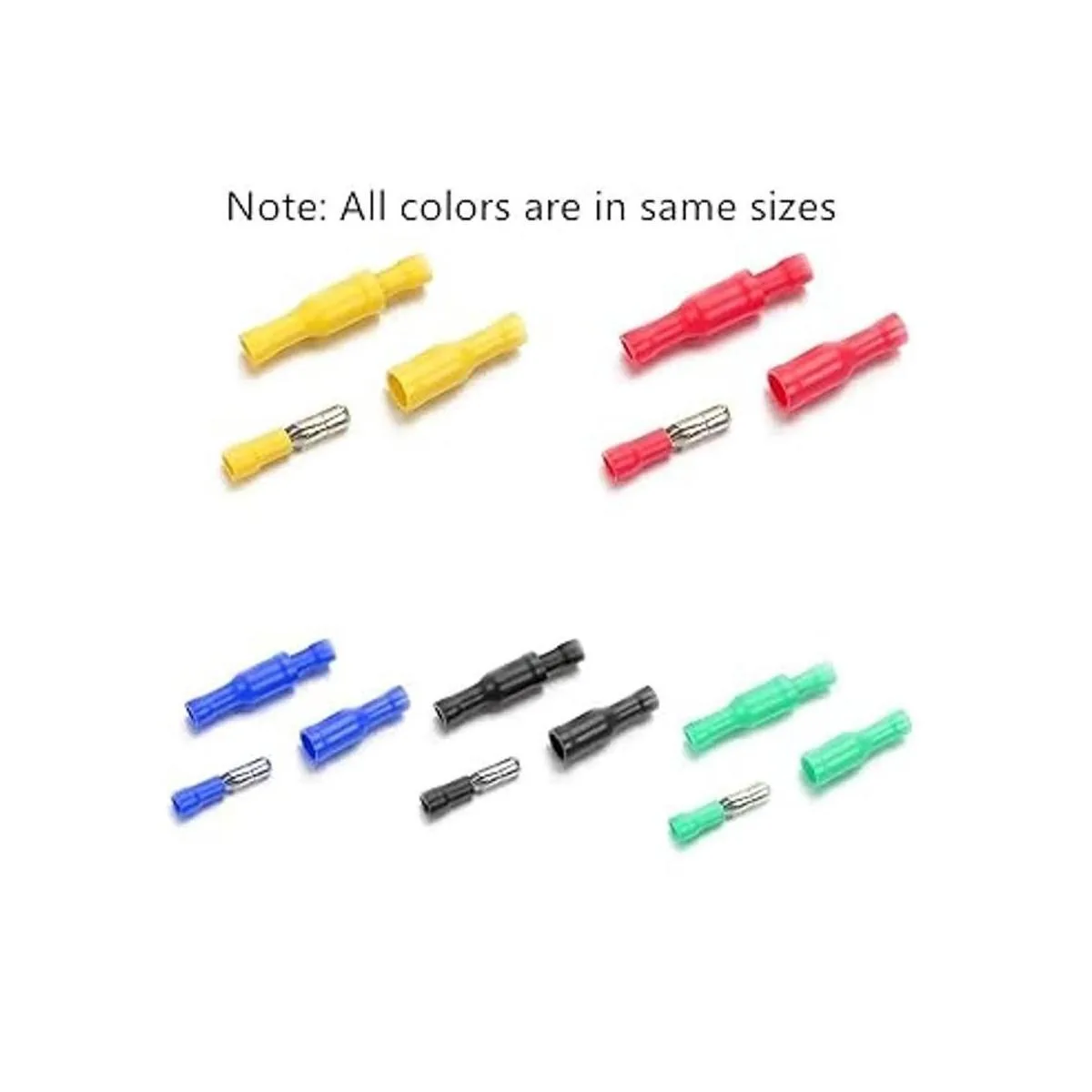 El paquete incluye: 200 piezas: 100 terminales de bala hembra 20 unidades/color 100 terminales de bala macho 20 unidades/color.