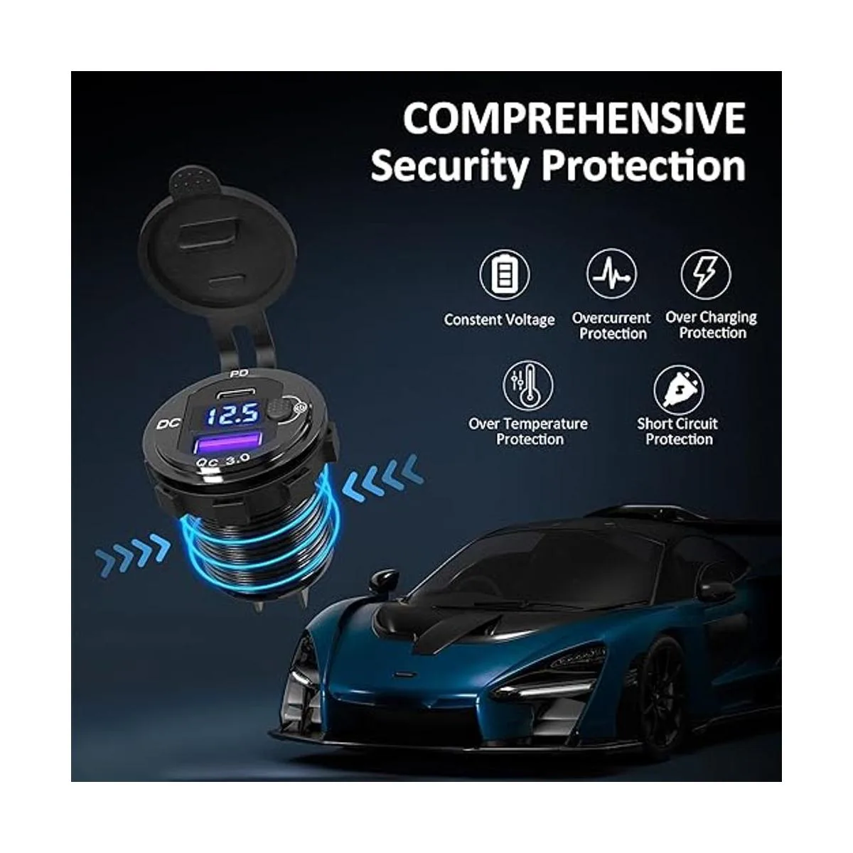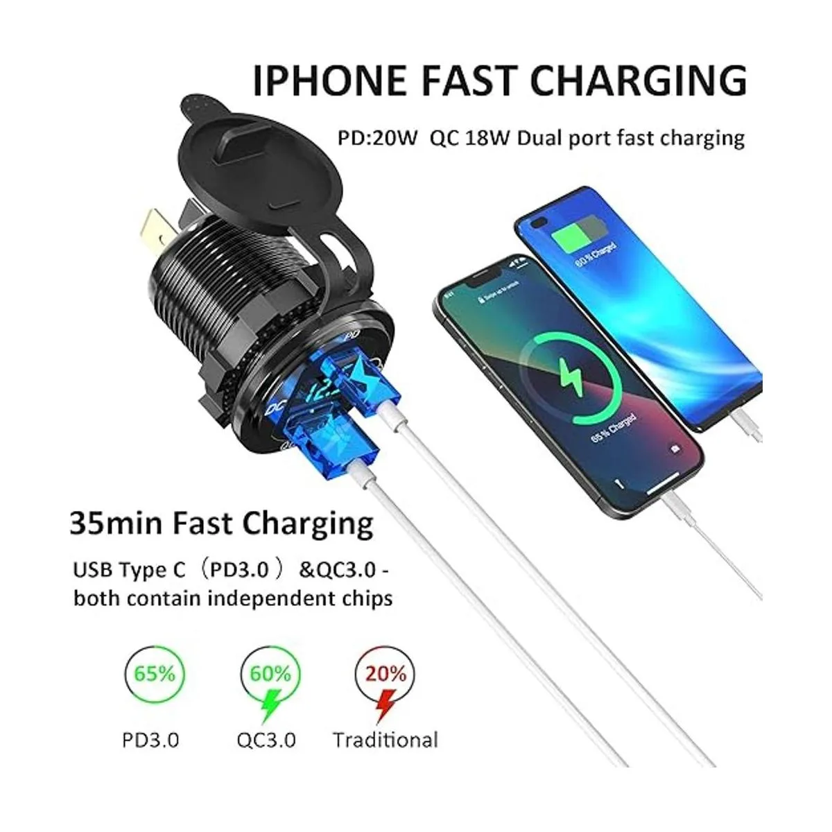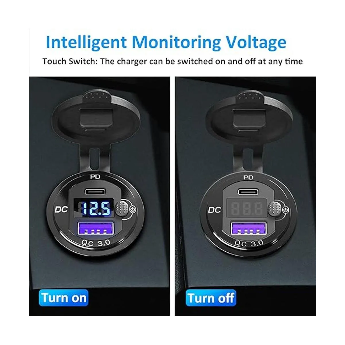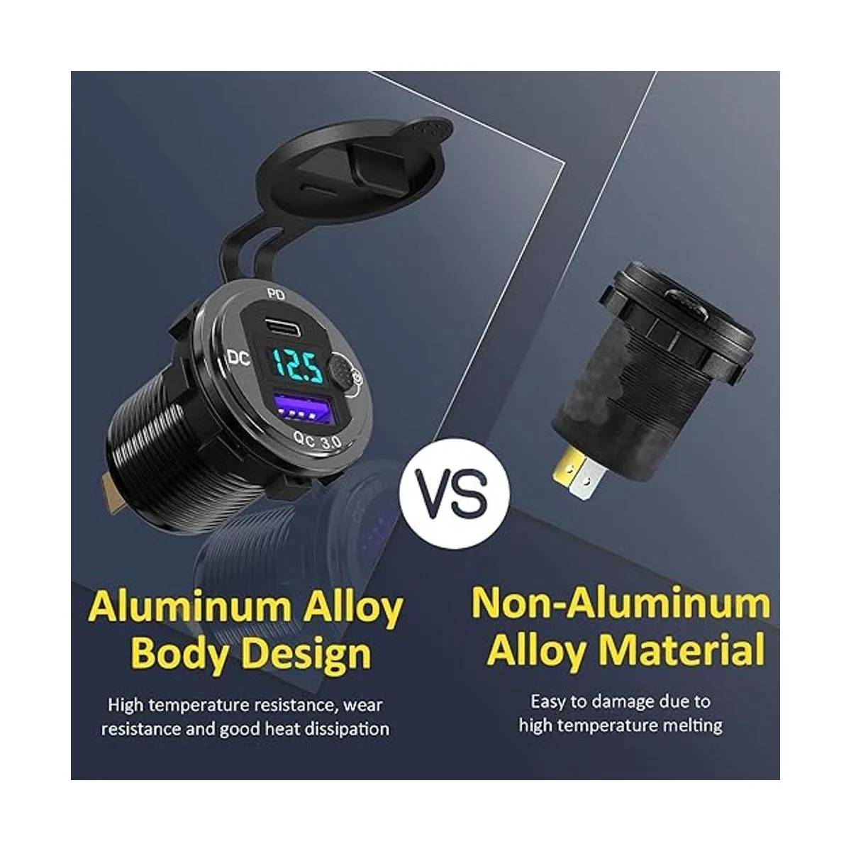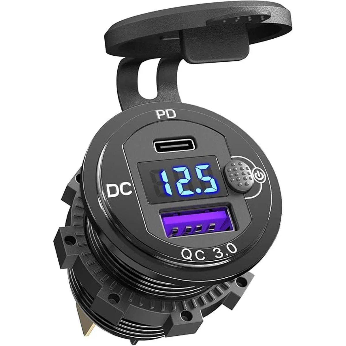 Qidoe Toma de corriente USB de 12 V, de aluminio, 12 V, USB C, tipo C, 20 W y control de calidad, 3.0, 18 W, puerto USB con voltímetro LED, adaptador de interruptor de alimentación para coche marino, camión, motocicleta, océano, barco, carrito de golf, vehículo RV ATV