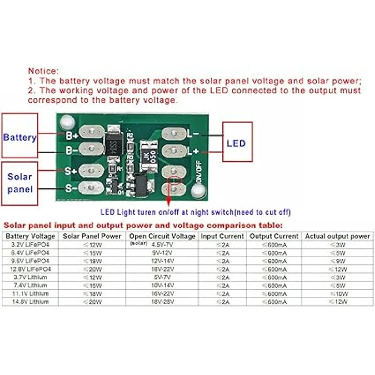 Nota: Las baterías deben utilizarse con placas protectoras. El voltaje de la batería y el voltaje y la potencia del panel solar deben coincidir. El voltaje de funcionamiento LED y la alimentación conectados a la salida deben coincidir con el voltaje de la batería.