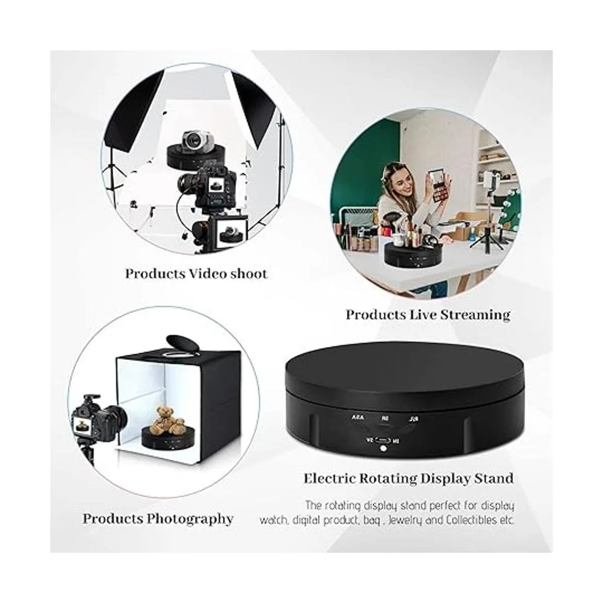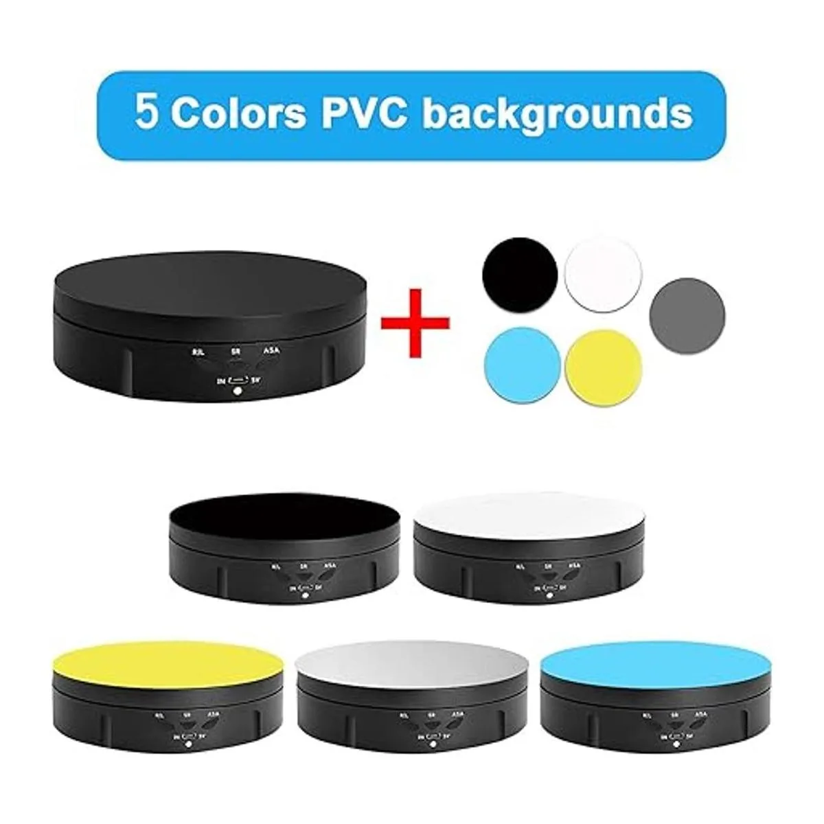 Qinmay Soporte de exhibición giratorio de 360 grados, tocadiscos de fotografía de 360 grados con control remoto, 5 fondos de PVC, bateríafuente de alimentación USB para exhibición de fotografía de productos