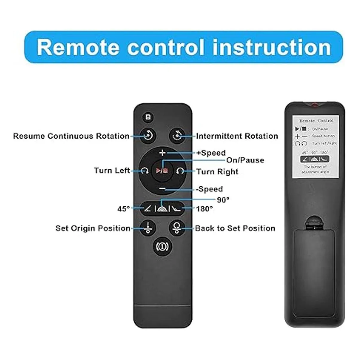 Flexible y ajustable: puedes controlar de forma remota el soporte giratorio eléctrico. Encendido: toca cualquier tecla. Apagado: pulsa cualquier tecla 3 segundos 1.R/L para dirección en sentido horario/antihorario. 2. SR para regulación de velocidad 246 revoluciones por minuto. 3. ASA puede ajustar el ángulo de rotación 4590180360 y luego círculo.