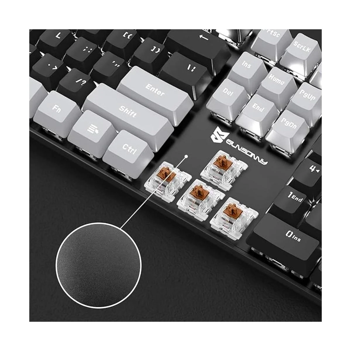 Teclado mecánico para juegos con interruptores marrones equivalente a Cherry MX que ofrece una rápida actuación para juegos, N Key Rollover y antighosting.
