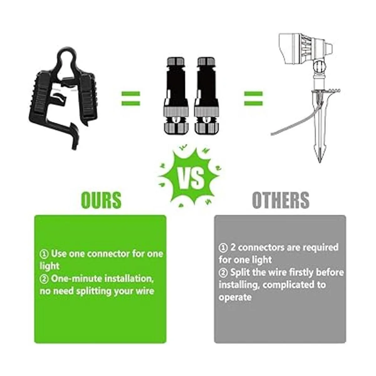 Paquete de 10 conectores para 10 luces: diseño innovador, un conector para una luz de paisajismo, no es necesario utilizar 2 piezas para conectar una luz como otras. Menos dinero para cubrir más luces, ahorra dinero.