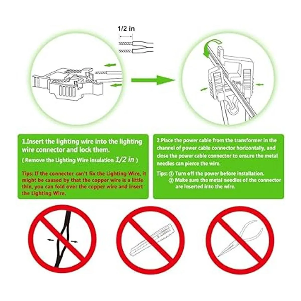 Fácil instalación: muy fácil de instalar, bloquea el cable sin cortar, engarzar o empalmar, no requiere herramientas. Instala rápidamente los conectores con tus luces de paisaje en 1 minuto.
