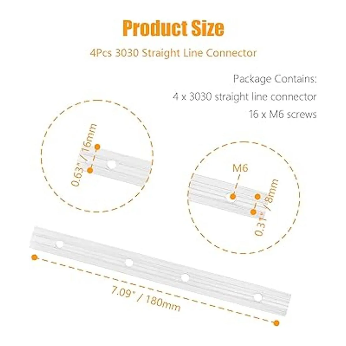 El paquete contiene: 4 conectores de línea recta 3030, 16 tornillos M6. Tamaño del soporte de esquina: 7.087 x 0.630 x 0.236 in largo x ancho x alto.