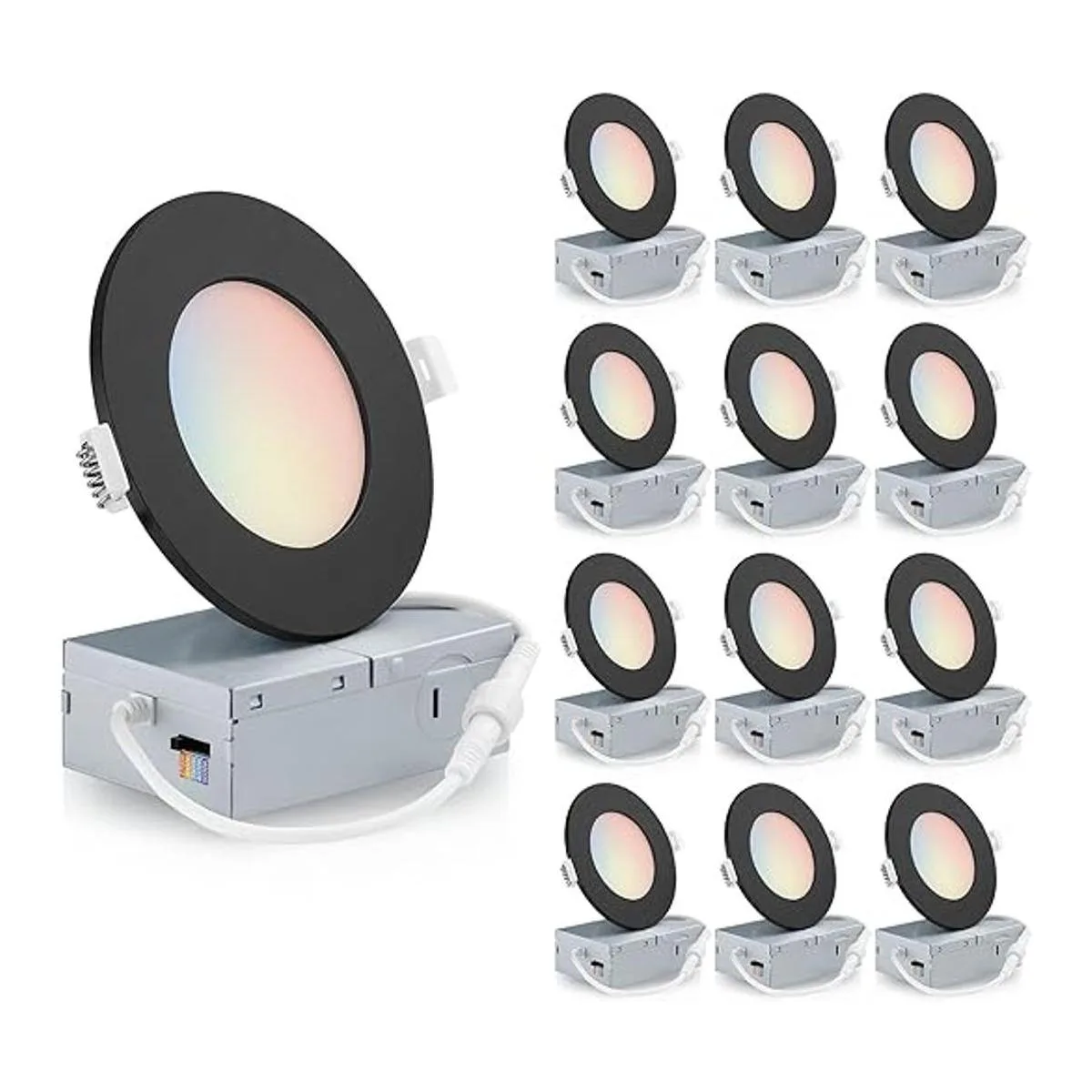 Qplus Iluminación empotrada de 4 pulgadas, ubicación húmeda, luces LED empotradas negras de 5 CCT con caja de conexiones, 2700 K3000 K3500 K4000 K5000 K, 10 W750 LM, luces LED empotradas ultra finas regulables de 4 pulgadas, paquete de 12
