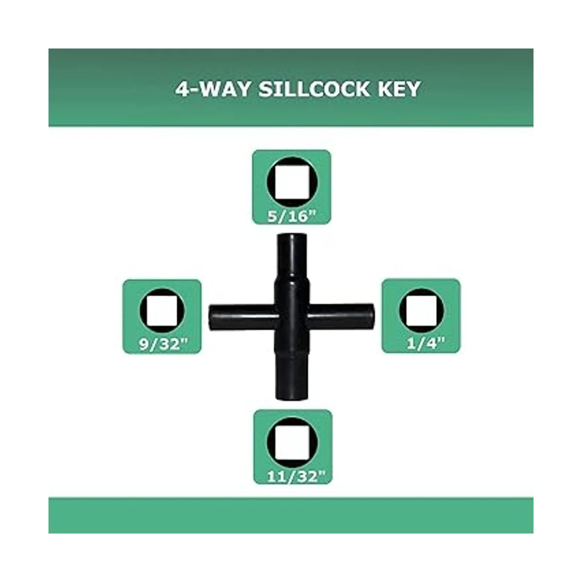 Especificaciones: llave de agua: 16 pulgadas de largo, mango de 10 pulgadas, apertura de llave de 3/4 pulgadas; Sillcock es de 3.1 pulgadas y tiene extremos con 1/4 pulgadas, 9/32 pulgadas, 5/16 pulgadas y 11/32 pulgadas para válvula, grifo y llave de seda
