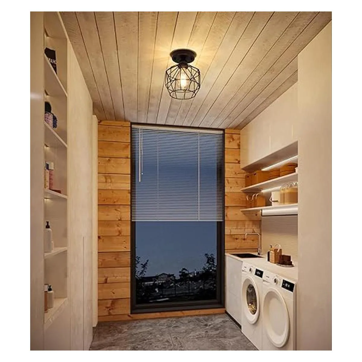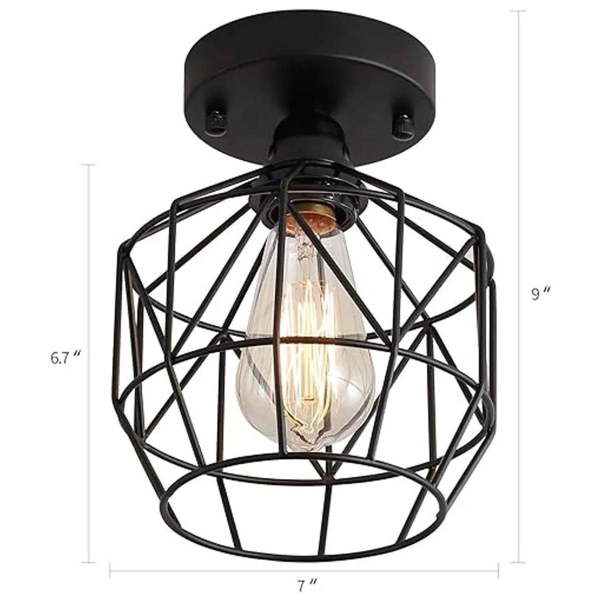 Diseño perfecto: la lámpara de techo pequeña industrial retro está acabada con una jaula pequeña soldada de metal de alta calidad y toldo de 4.7 pulgadas con una base E26, la lámpara de pasillo negra es pequeña pero bonita y simple, fácil de instalar, adecuada para la instalación en cualquier espacio pequeño, como caravana/caravana/remolque de viaje, pasillo, balcón, armarios, sótano, estudio, etc.