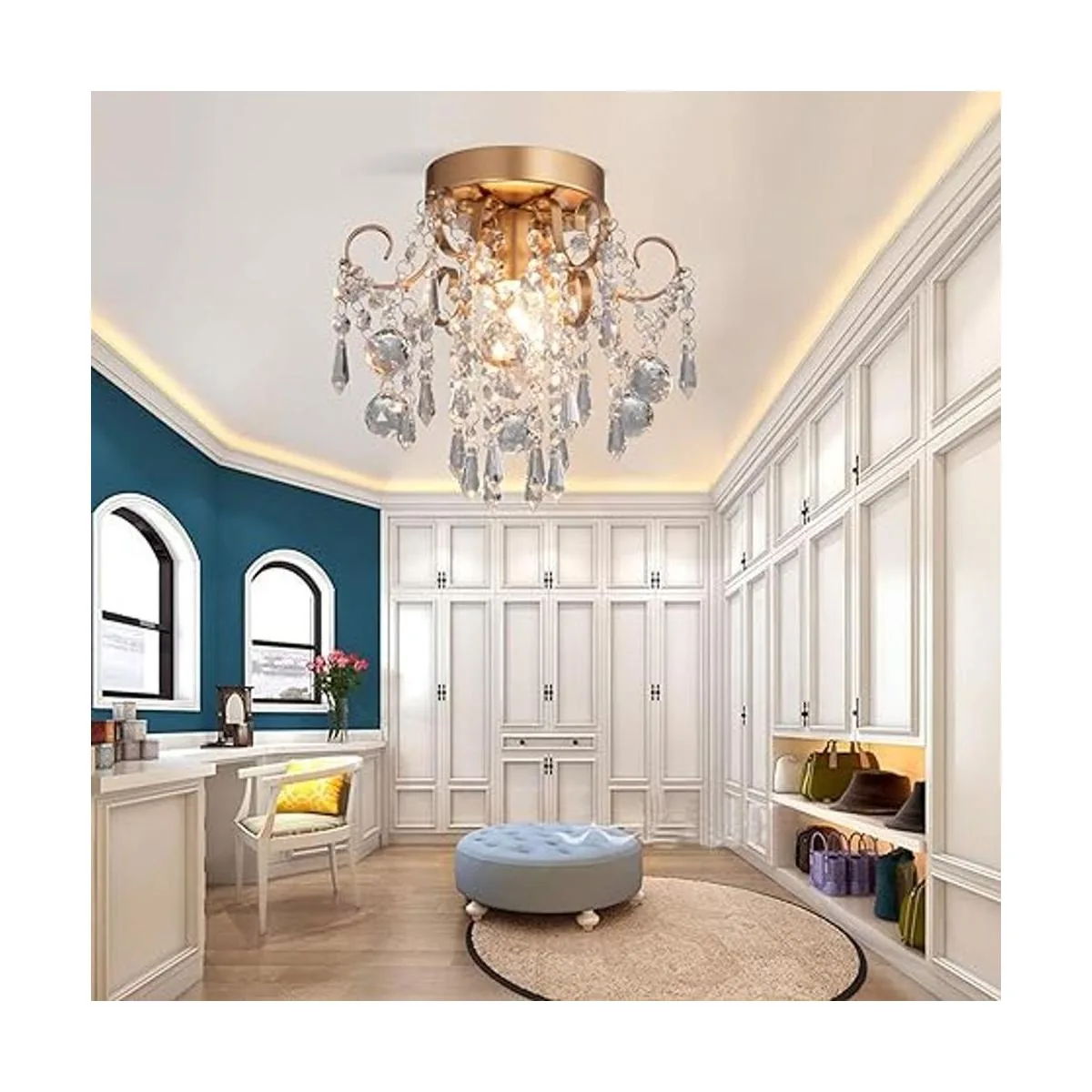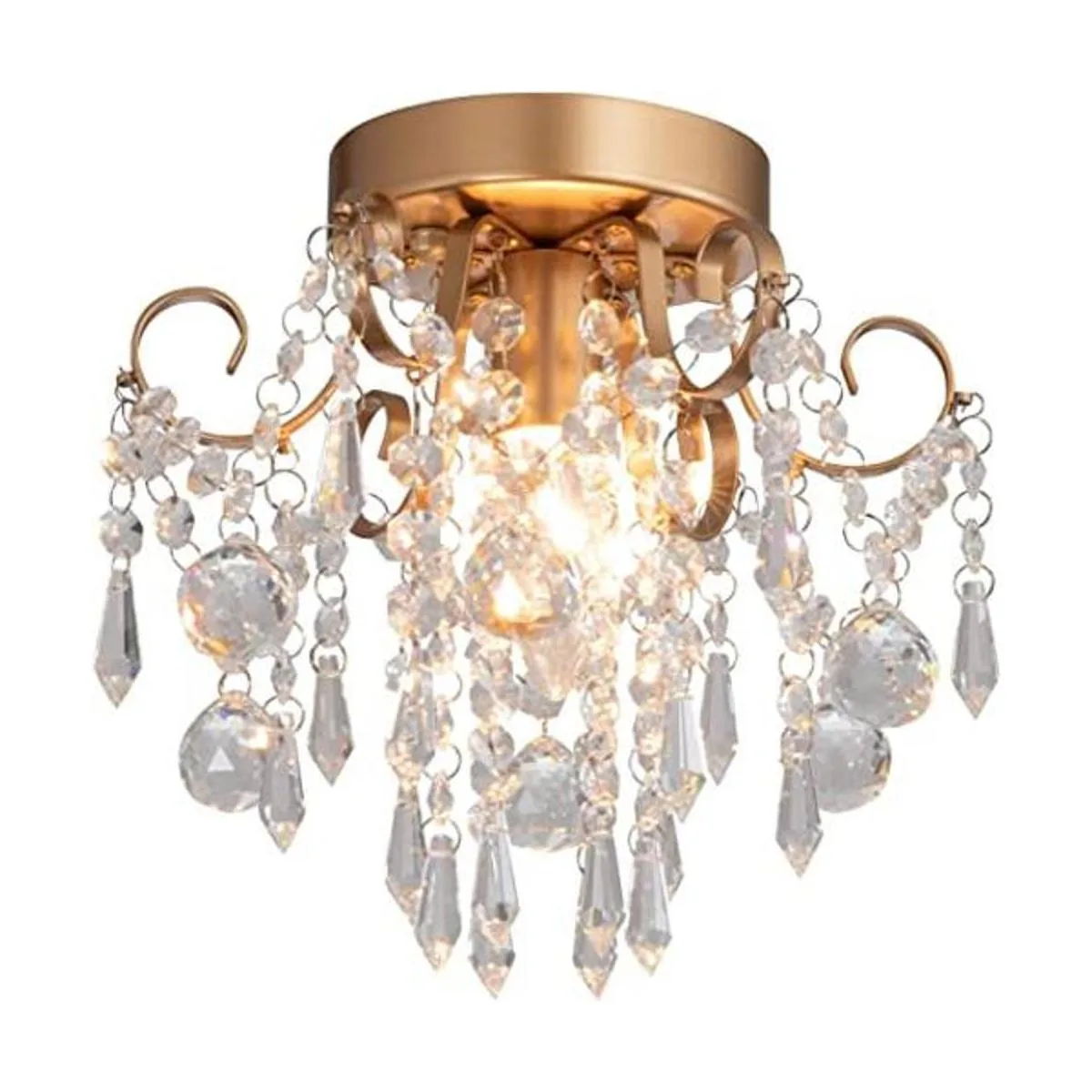 QS Mini lámpara de techo de cristal, pequeña lámpara de araña de montaje empotrado, entrada, dormitorio, baño, pasillo, lámpara dorada.