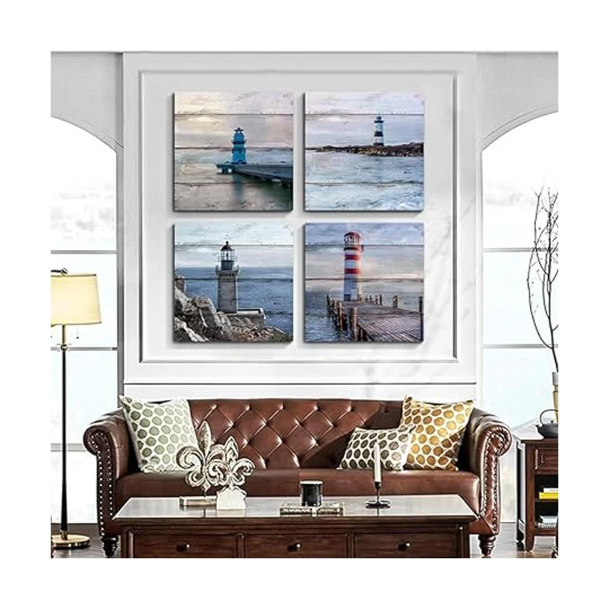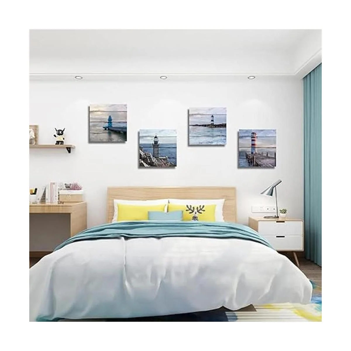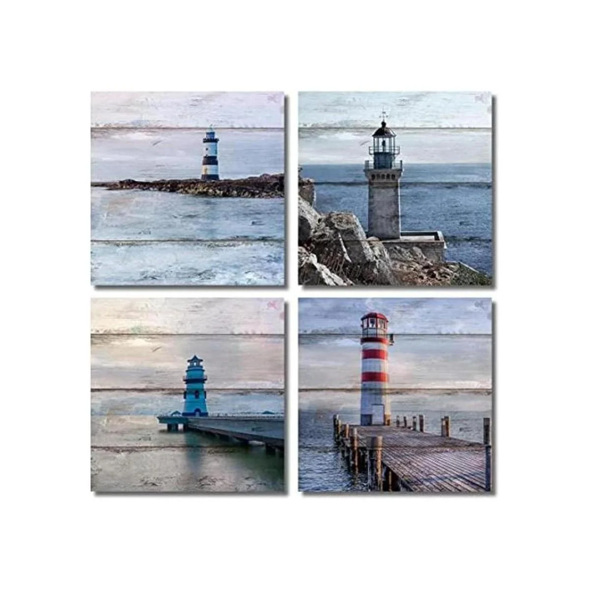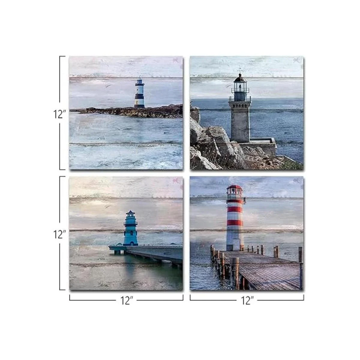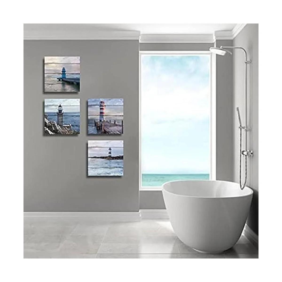 QTESPEII 4 piezas náuticas para decoración de baño, faro, lienzo para pared, arte vintage azul océano, pinturas costeras para dormitorio, decoración grande y moderna para el hogar, oficina, enmarcado en torre roja, obra de arte de 12 x 12 pulgadas
