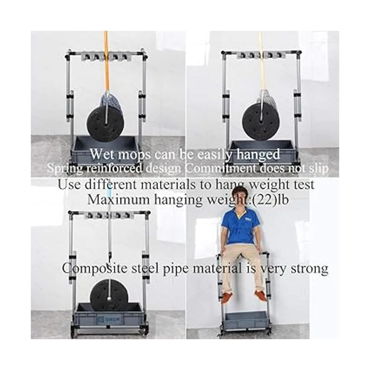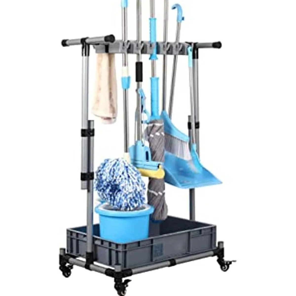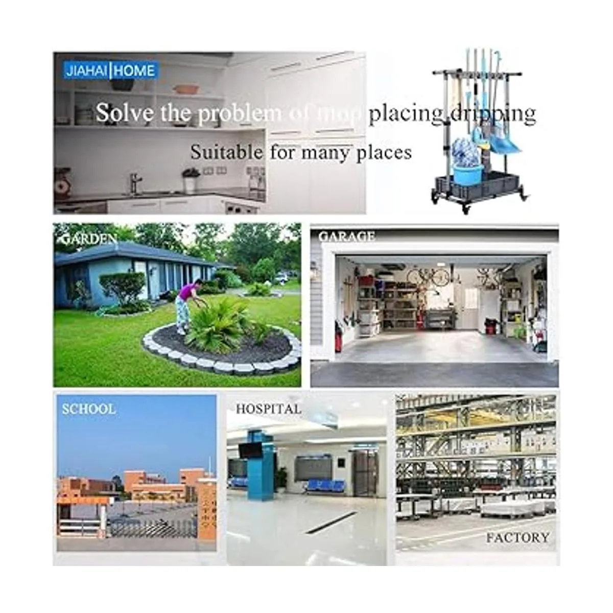 QTJH Soporte para escoba y trapeador para trapeadores húmedos movible montado en el suelo, estante de herramientas de limpieza de pie para almacenamiento de carro de herramientas de limpieza para jardín, garaje, escuelas, hospitales, fábricas, hoteles, empresas inmobiliarias