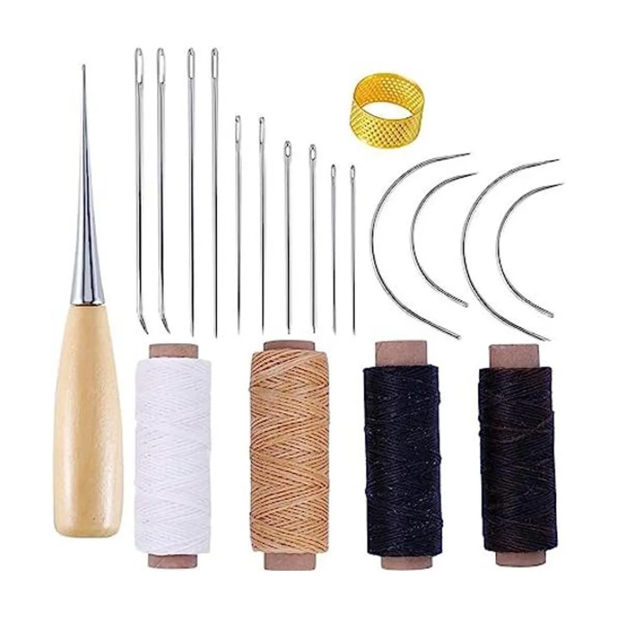 Qtopun Juego de agujas de reparación de cuero y hilos encerados, 20 piezas, herramientas de bricolaje de cuero, 7 tipos, agujas de coser para el hogar, agujas curvadas, perforación de agujeros, práctico punzón y dedal